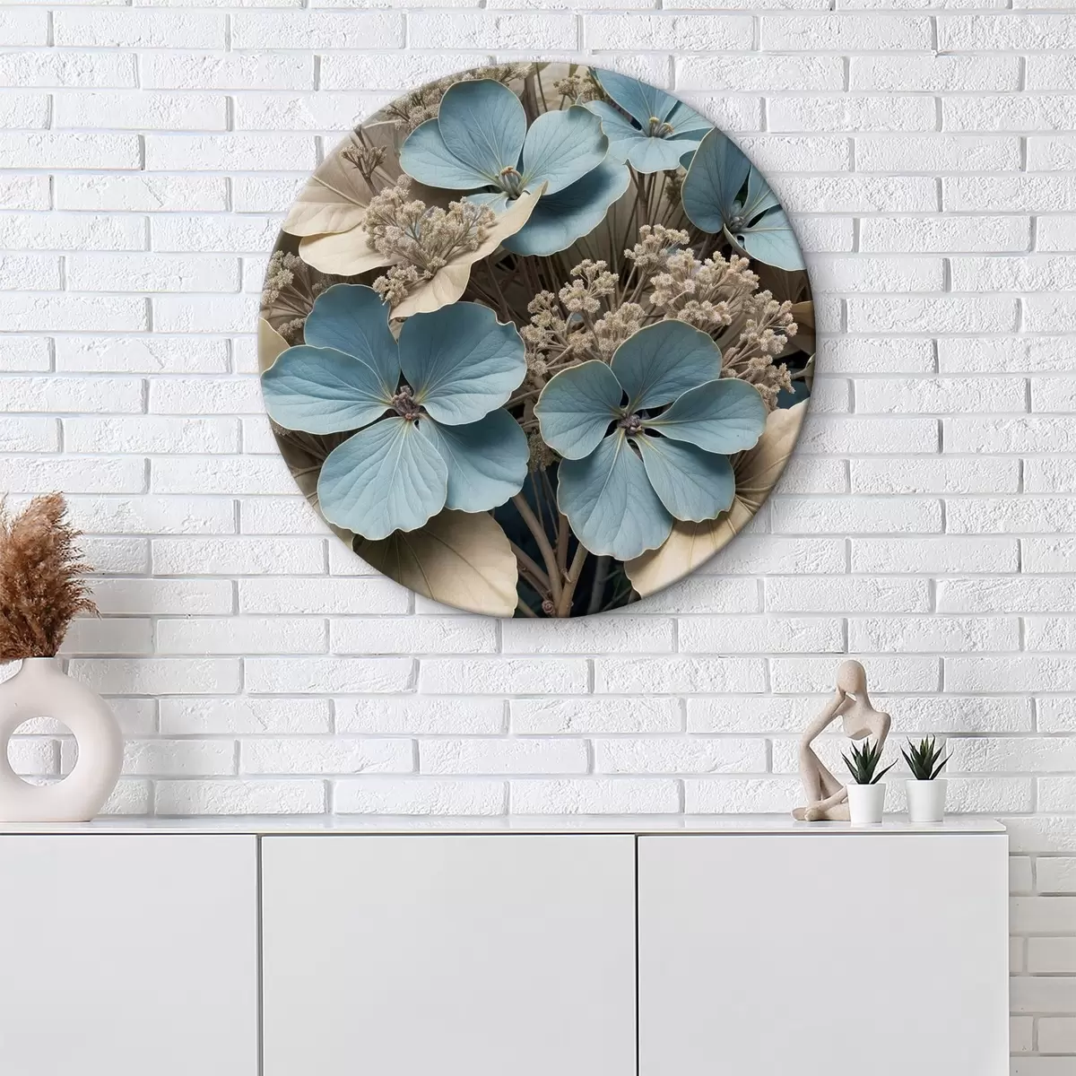 Quadri rotondi Primo piano di fiori blu e bianchi con petali morbidi e sfocati su uno sfondo marrone r39517