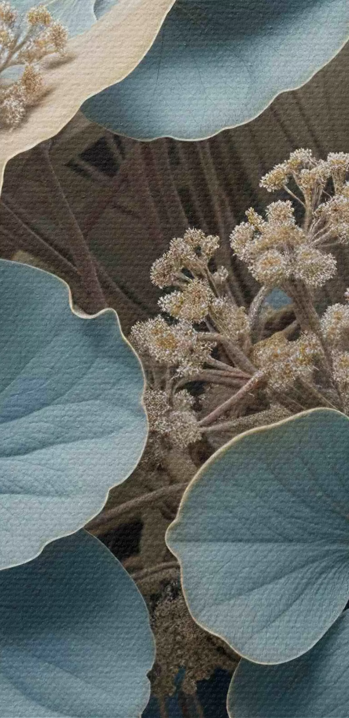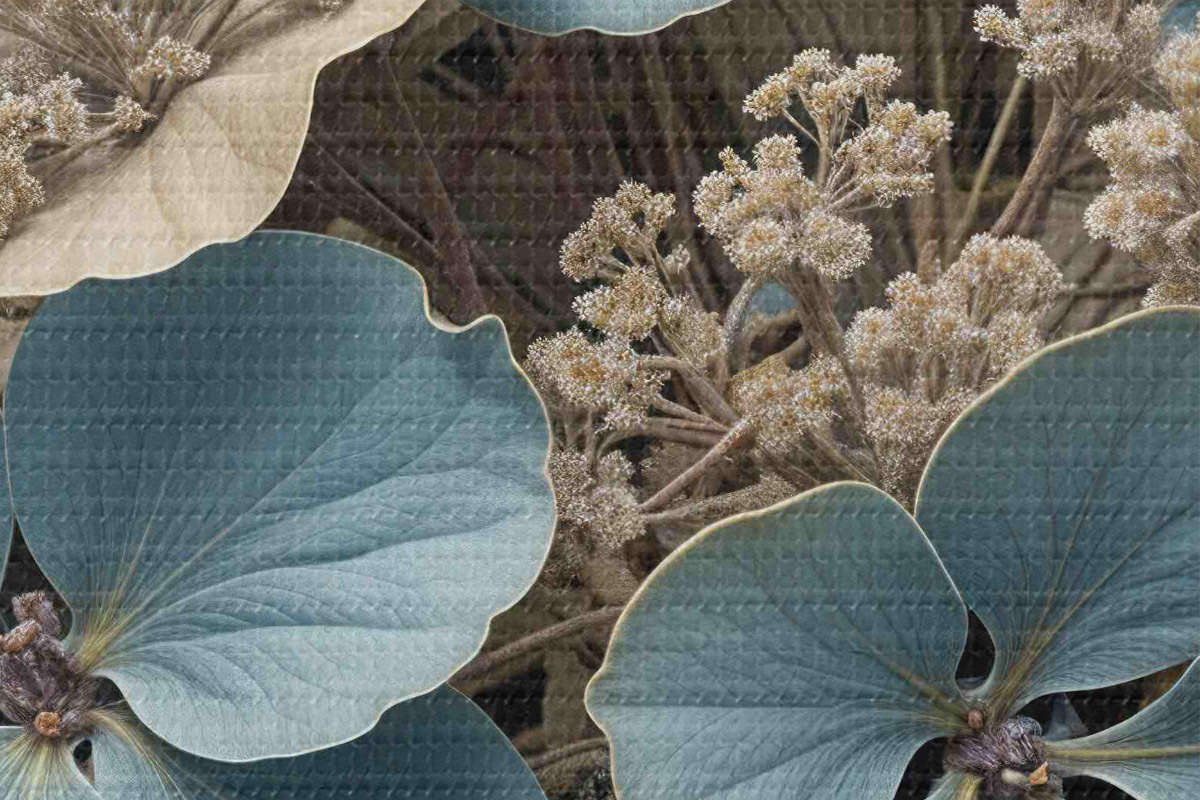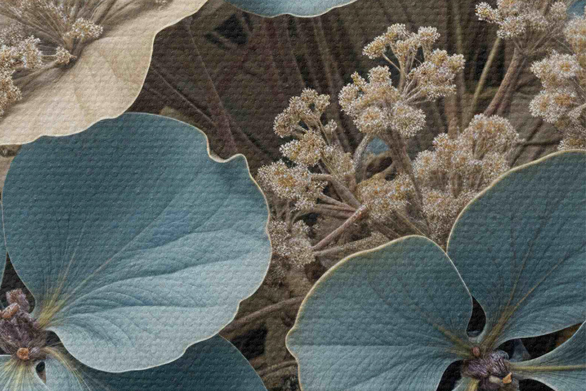 Immagine Primo piano di fiori blu e bianchi con petali morbidi e sfocati su uno sfondo marrone Nr r39517