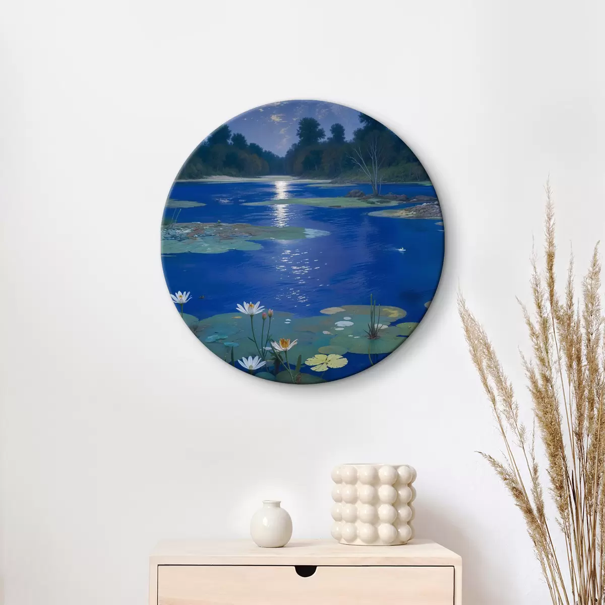 Quadri rotondi Lago di notte con la luna piena che si riflette nell'acqua con alberi verdi e ninfee r39526