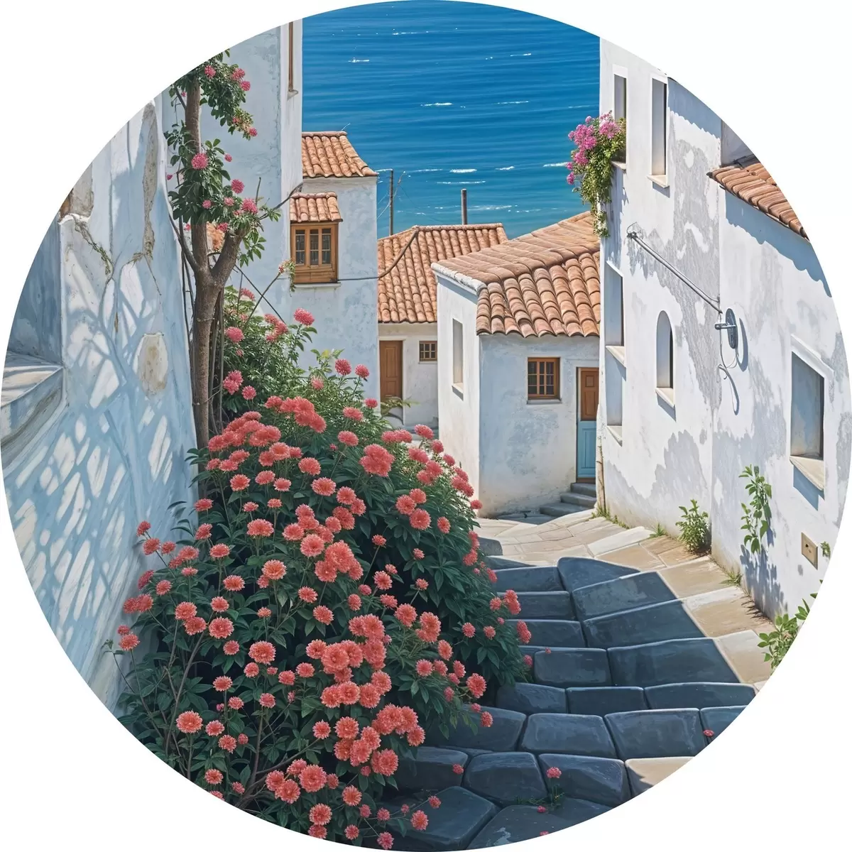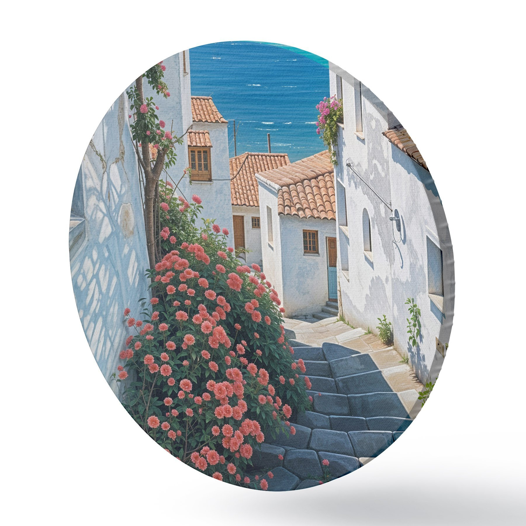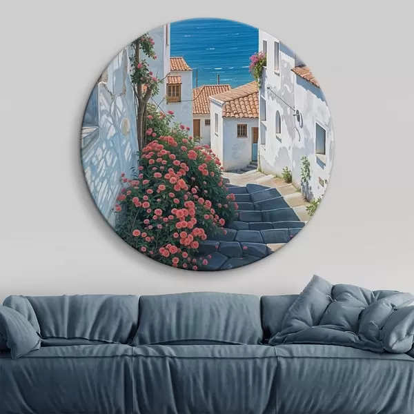 Quadri rotondi Una strada stretta in una città costiera, con edifici bianchi, tetti di tegole rosse e vivaci fiori rosa r39532