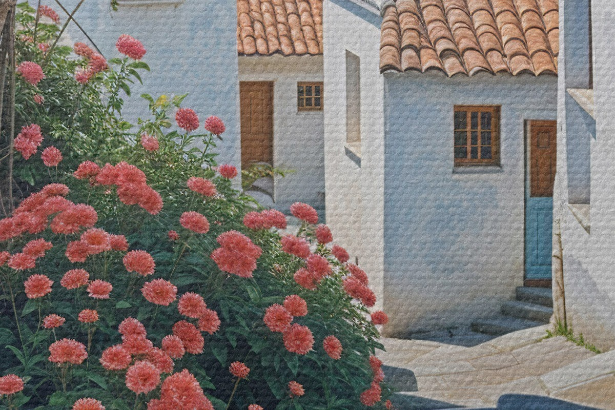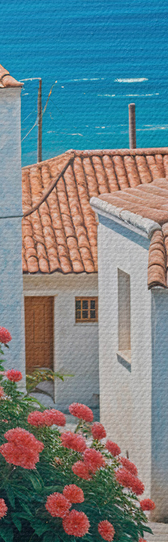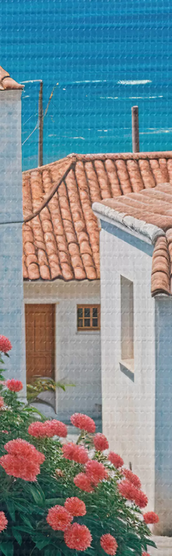 Immagine Una strada stretta in una città costiera, con edifici bianchi, tetti di tegole rosse e vivaci fiori rosa Nr r39532