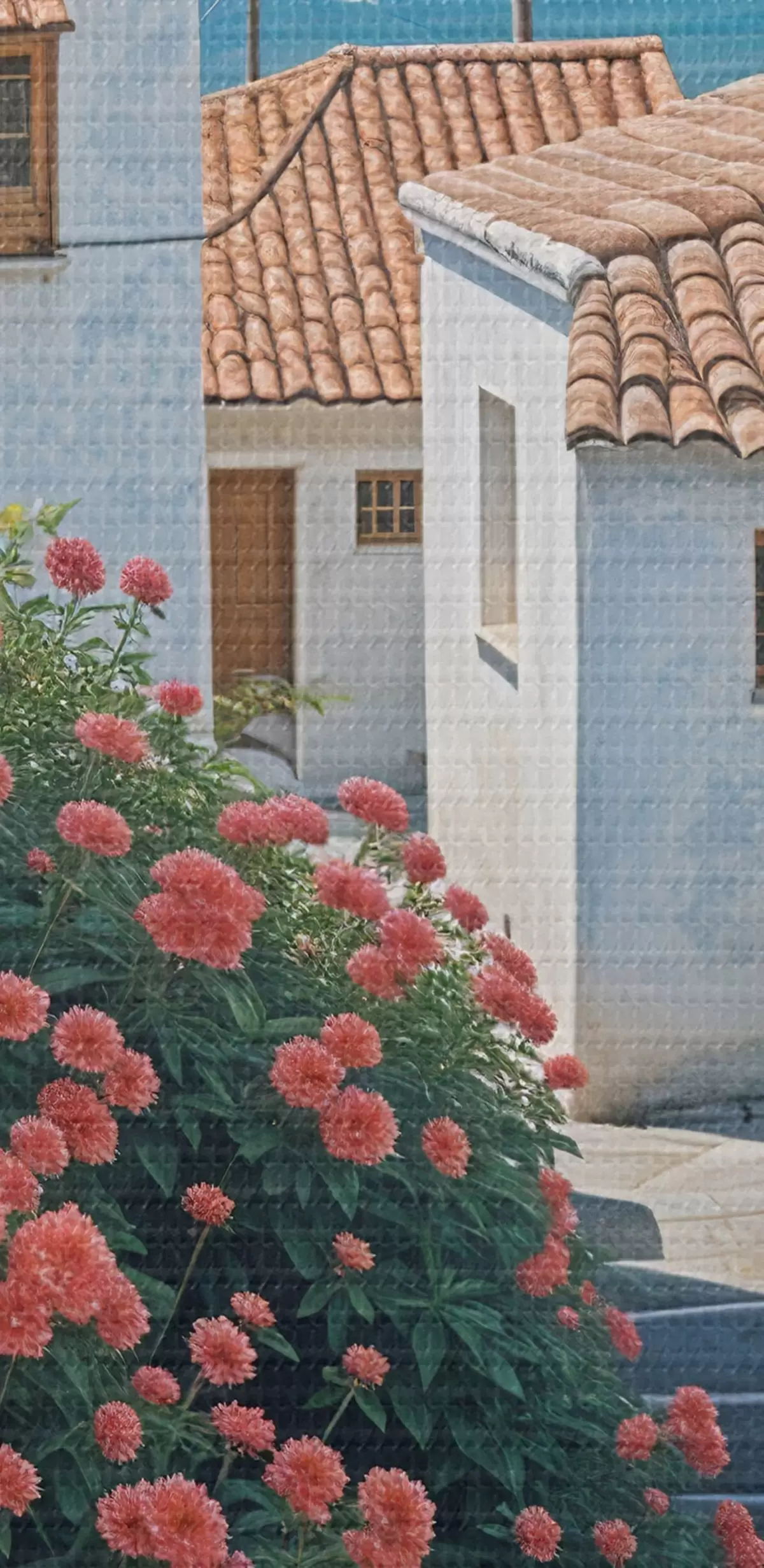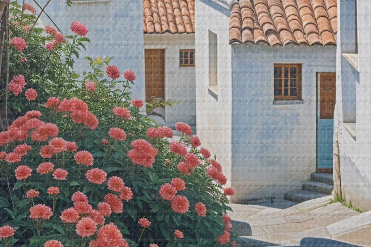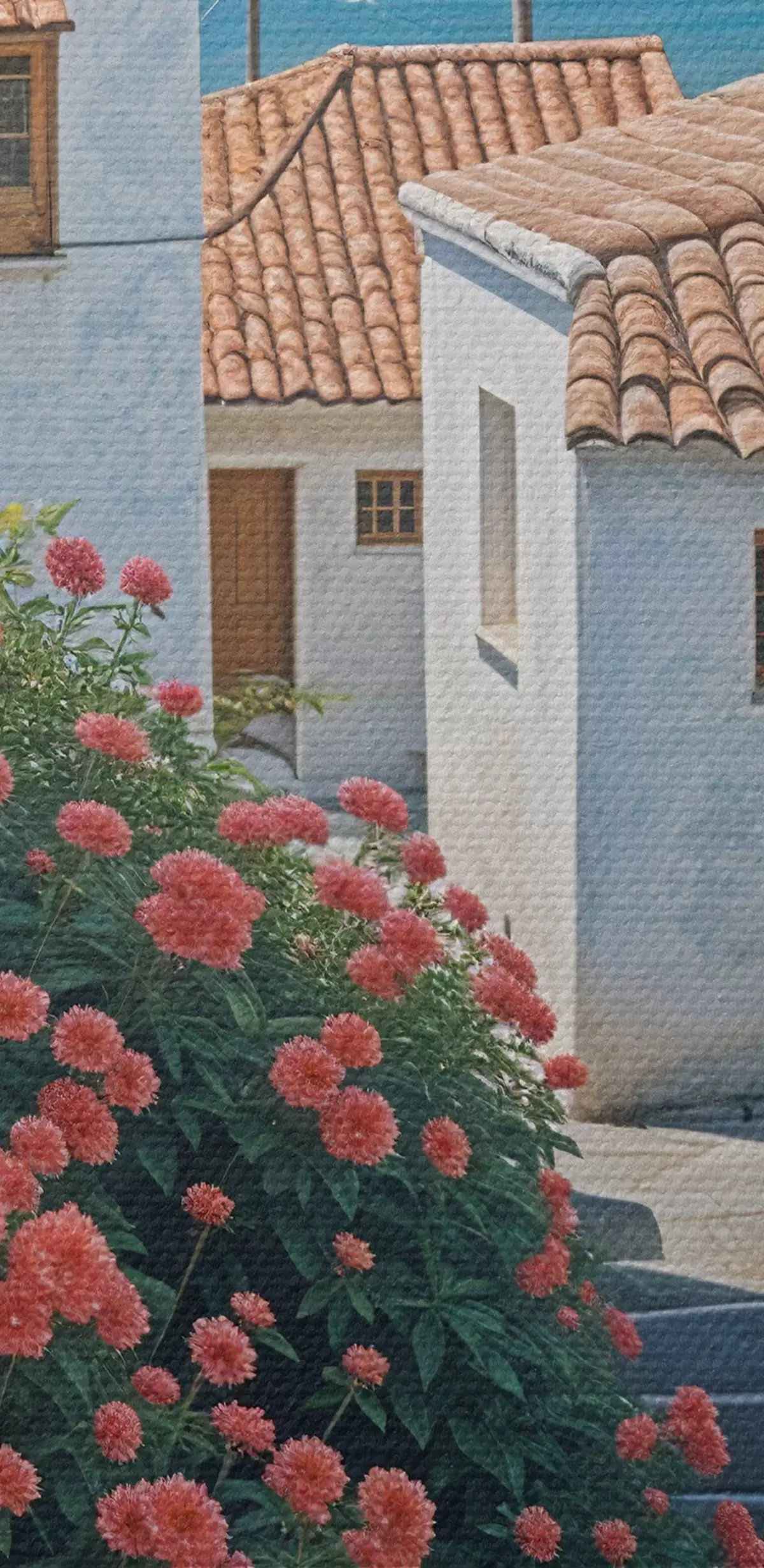 Immagine Una strada stretta in una città costiera, con edifici bianchi, tetti di tegole rosse e vivaci fiori rosa Nr r39532