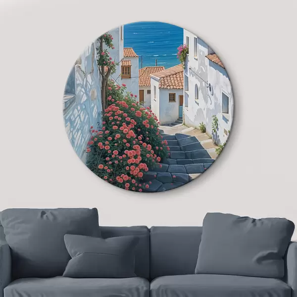 Quadri rotondi Una strada stretta in una città costiera, con edifici bianchi, tetti di tegole rosse e vivaci fiori rosa r39532