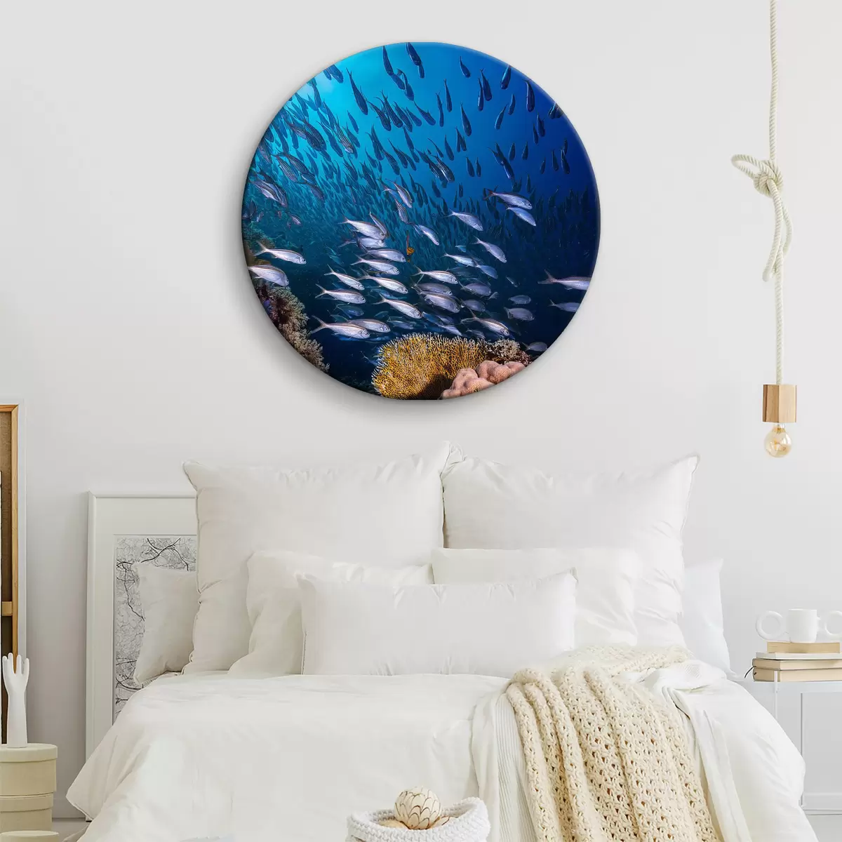 Quadri rotondi molti piccoli pesci vicino ai coralli r39625