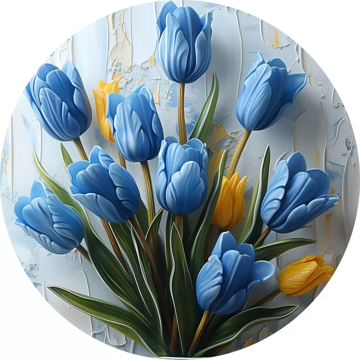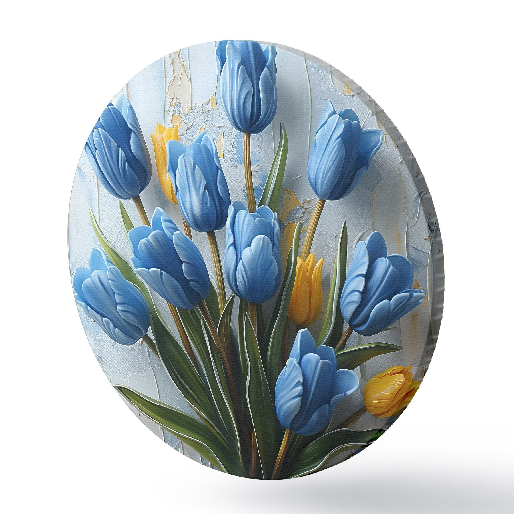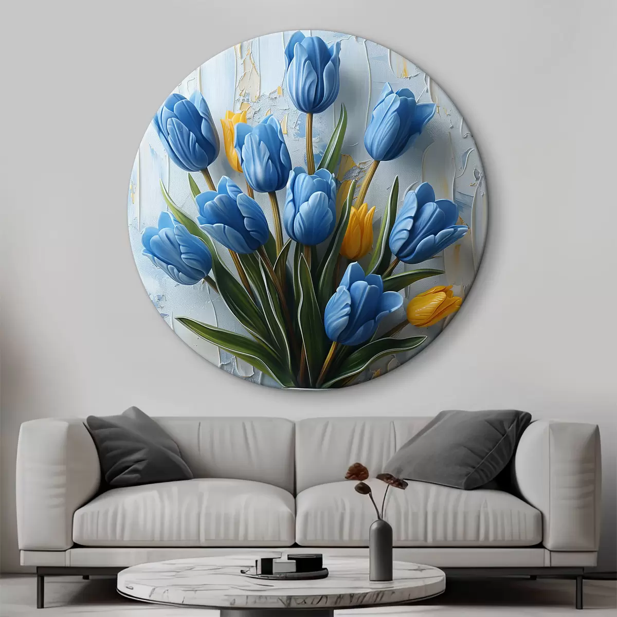 Quadri rotondi Tulipani blu e gialli in 3D: elegante quadro da parete dipinto ad olio con fondo bianco e azzurro e vaso inciso r39637