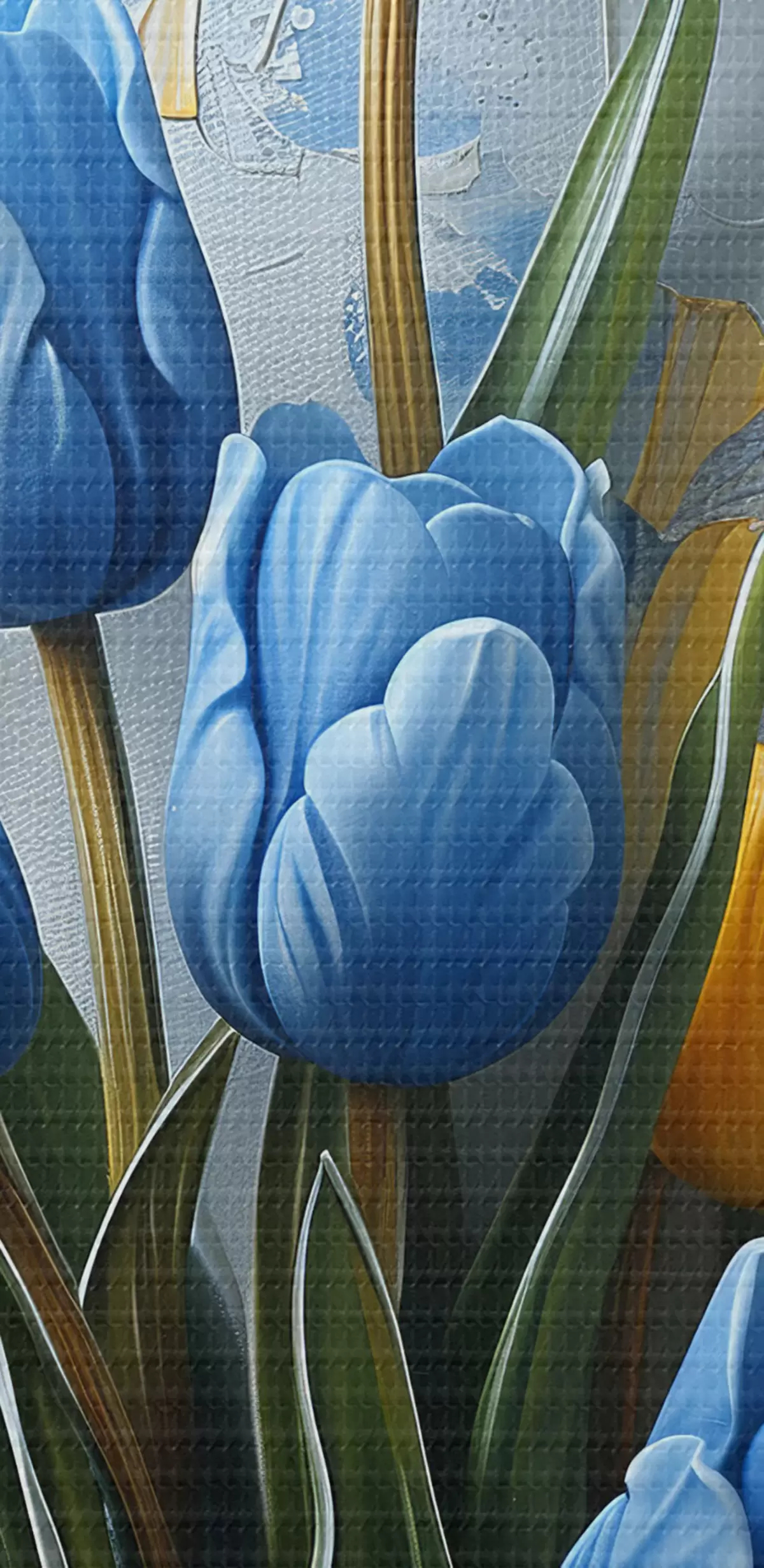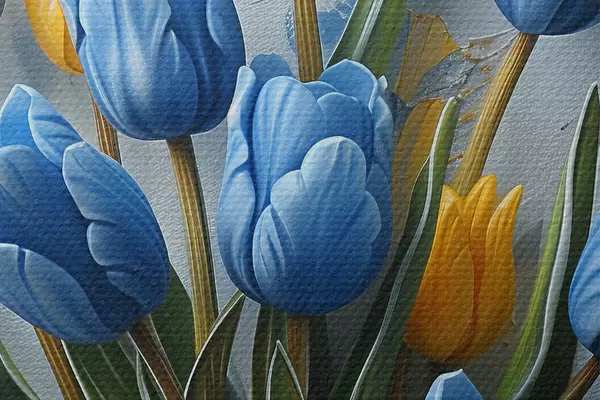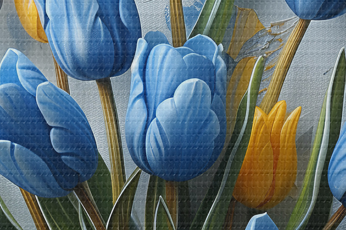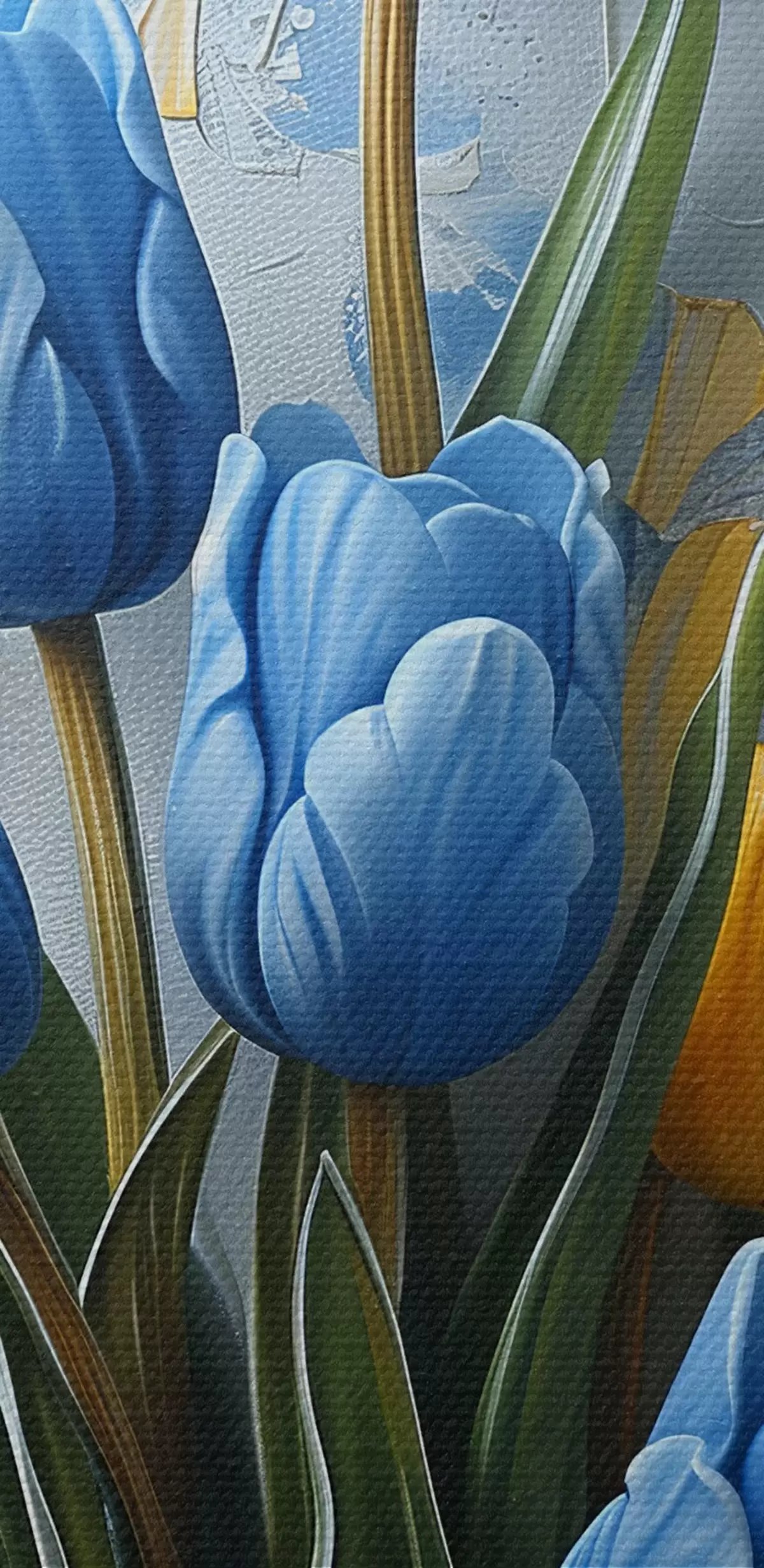 Immagine Tulipani blu e gialli in 3D: elegante quadro da parete dipinto ad olio con fondo bianco e azzurro e vaso inciso Nr r39637