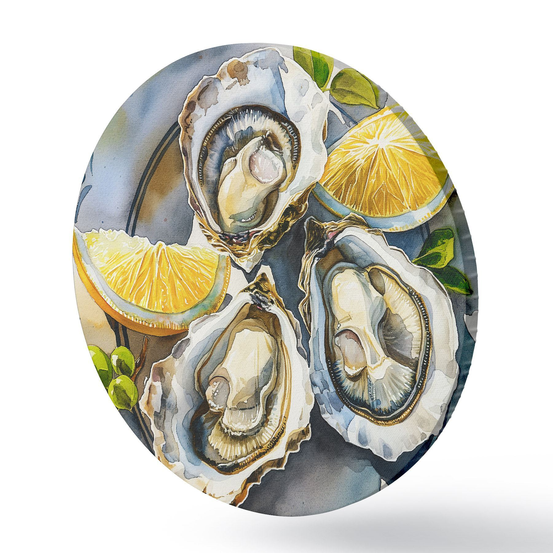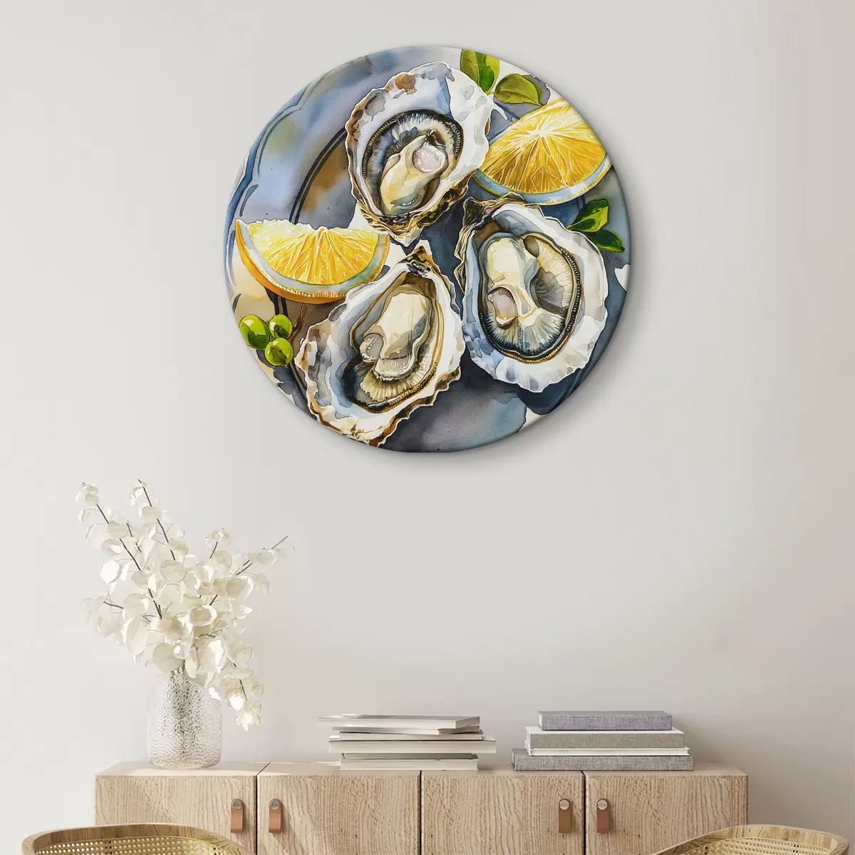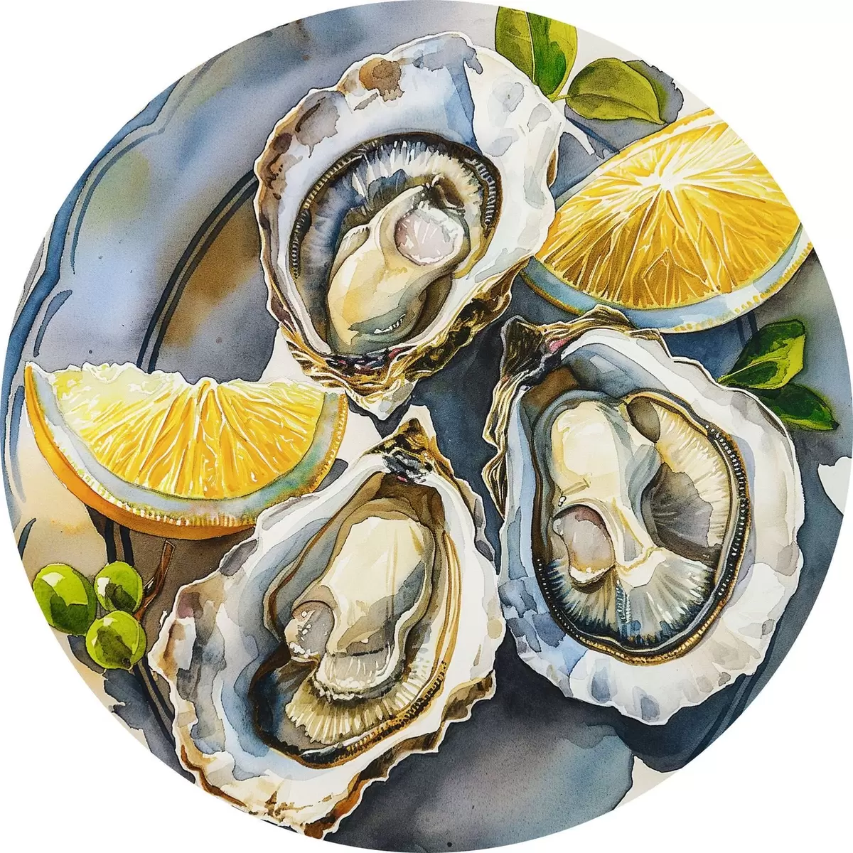 Quadri rotondi Ostriche eleganti sul piatto, acquerello, limoni, colori naturali, mediterranei r39711