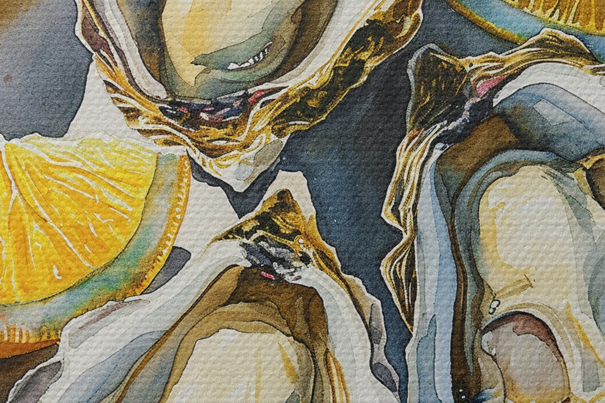 Immagine Ostriche eleganti sul piatto, acquerello, limoni, colori naturali, mediterranei Nr r39711