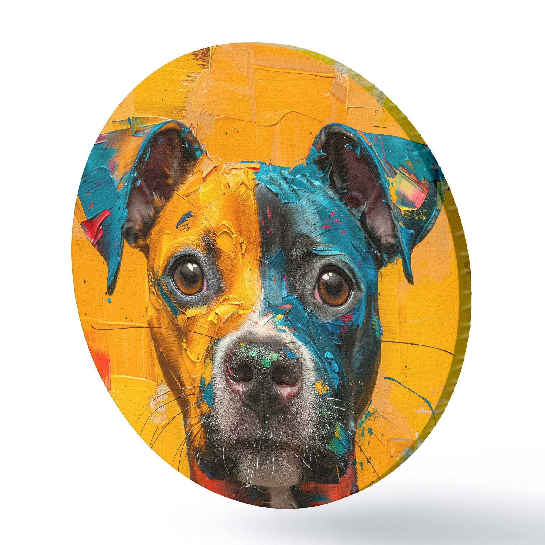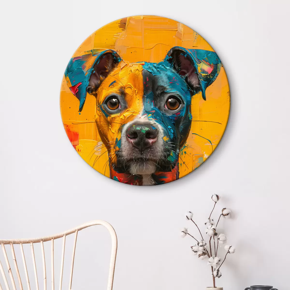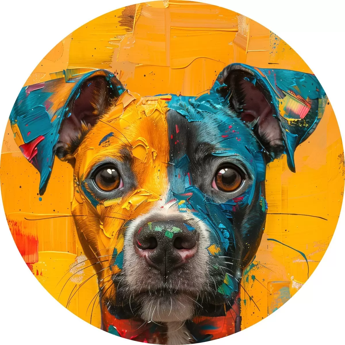 Quadri rotondi Ritratto di un Pitbull con pennellate di olio giallo e blu r39722