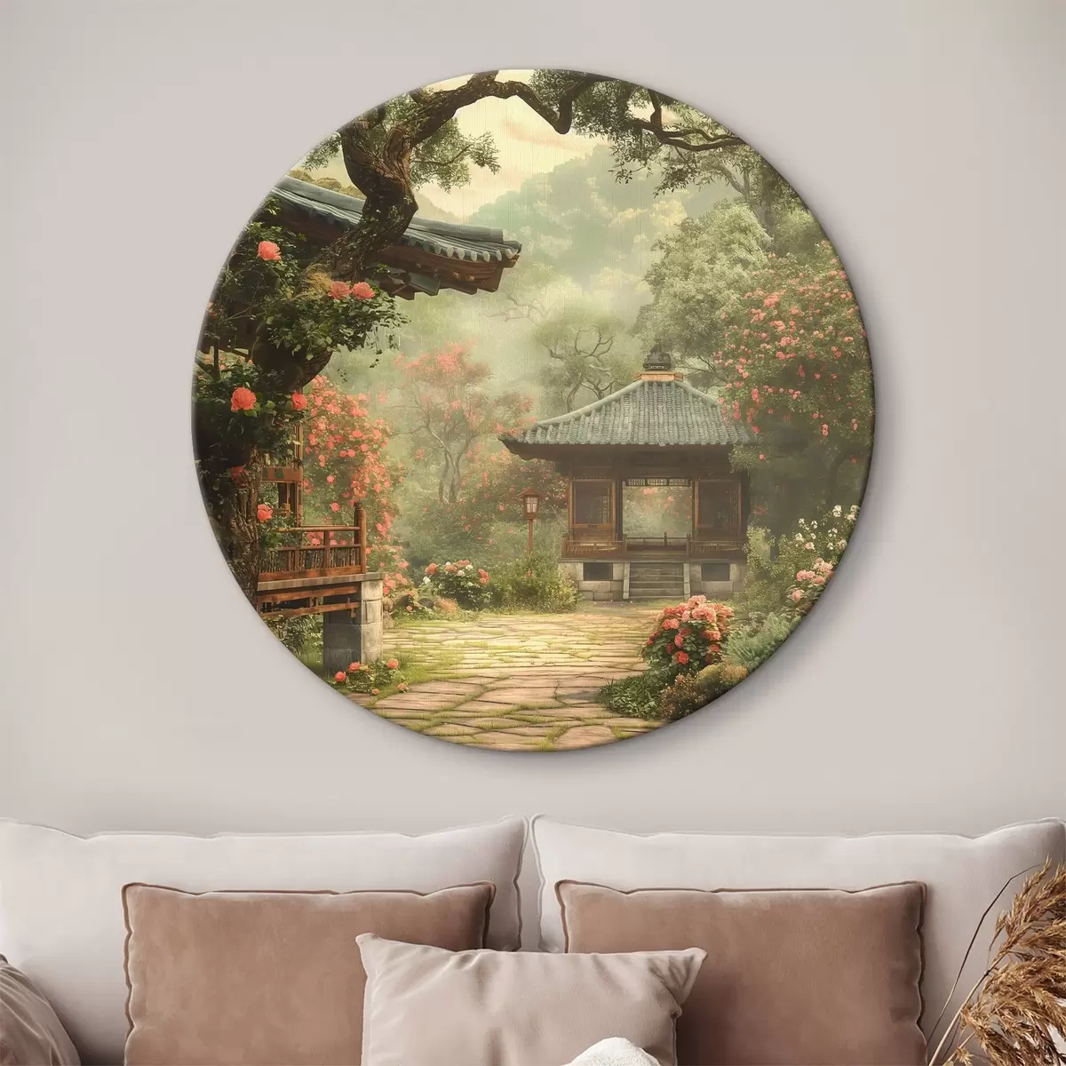 Quadri rotondi Parco giapponese con alberi e fiori in fiore, foresta, casa in legno r39773