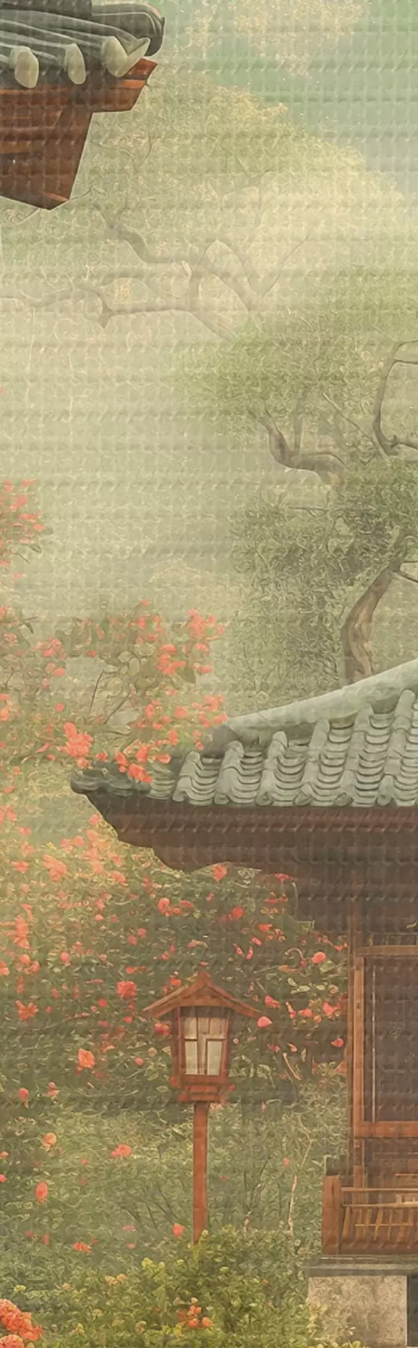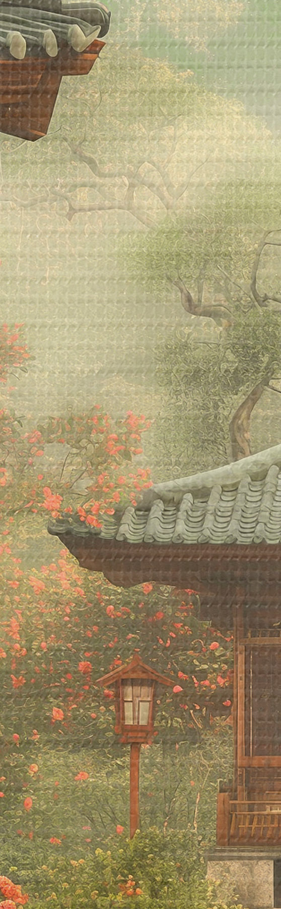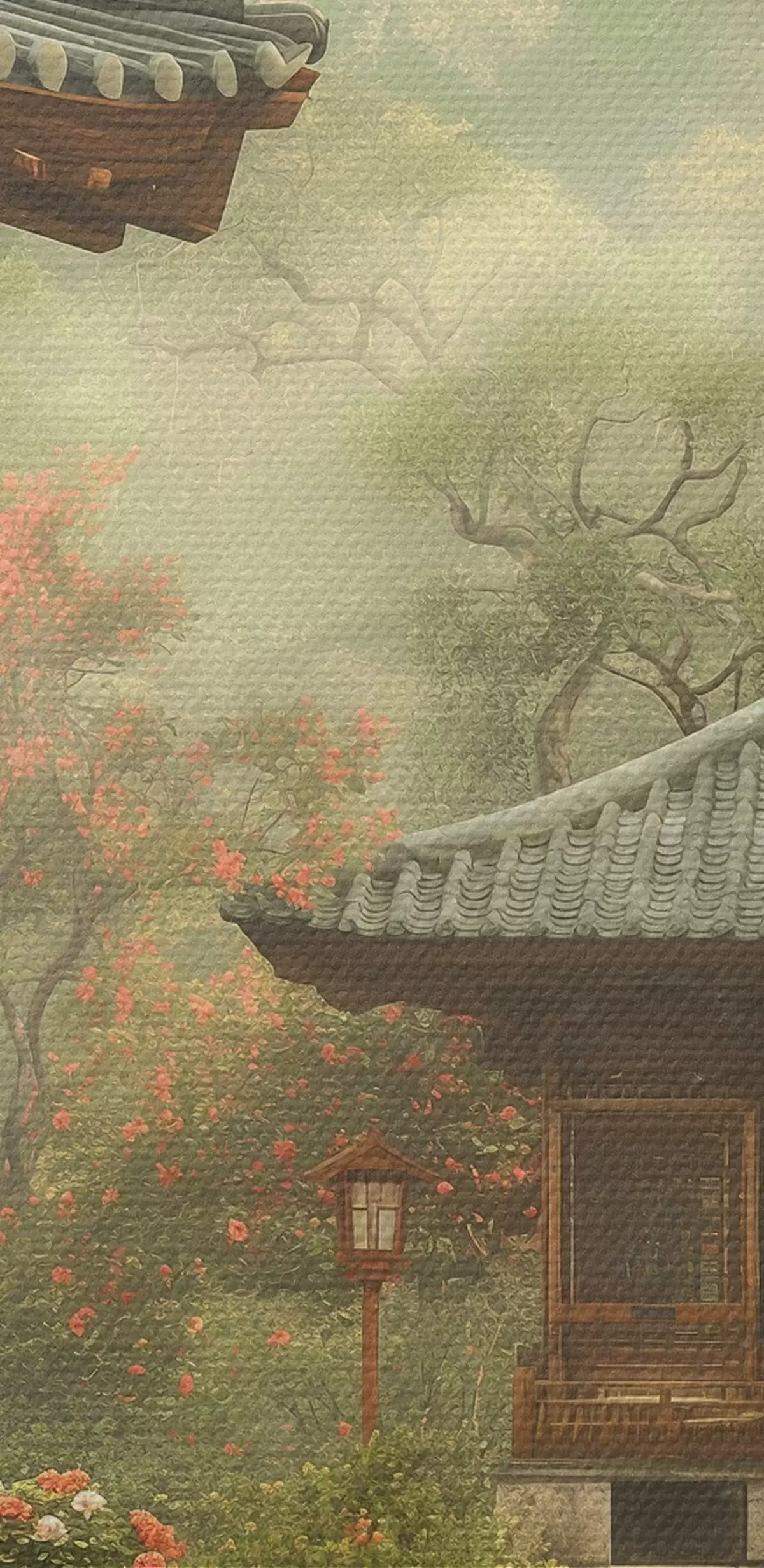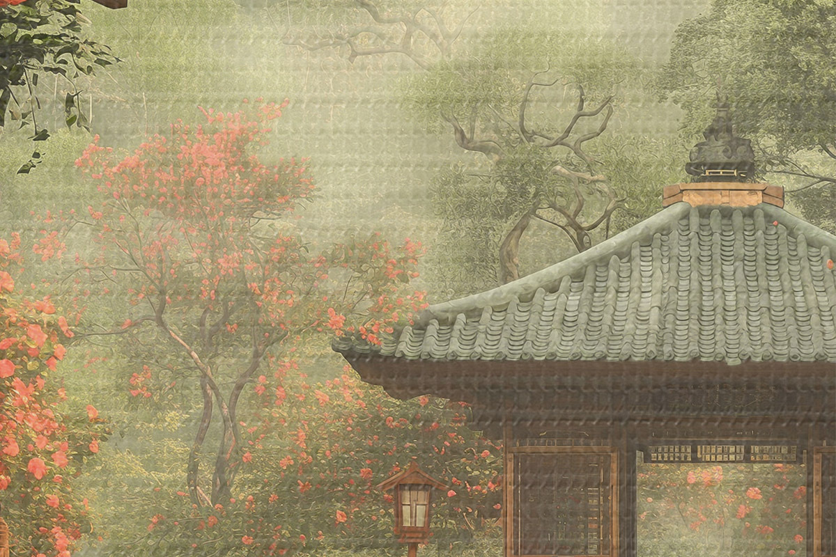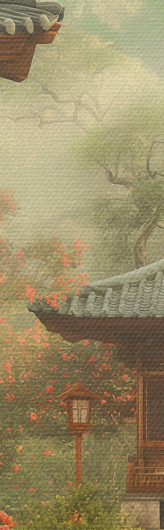 Immagine Parco giapponese con alberi e fiori in fiore, foresta, casa in legno Nr r39773