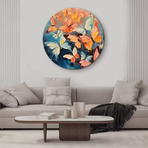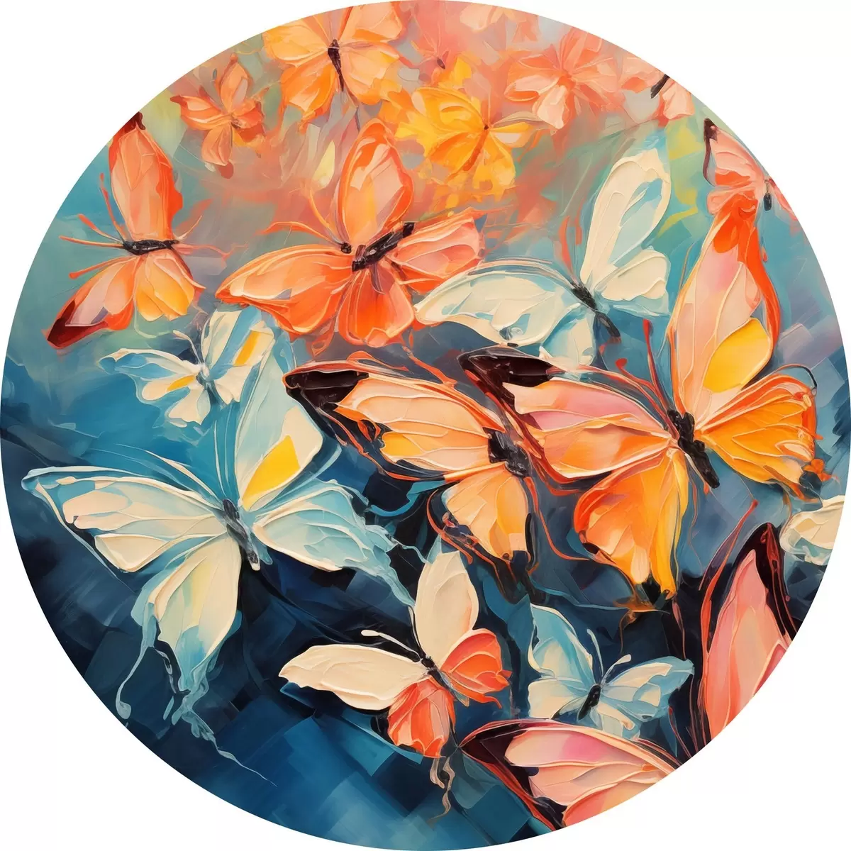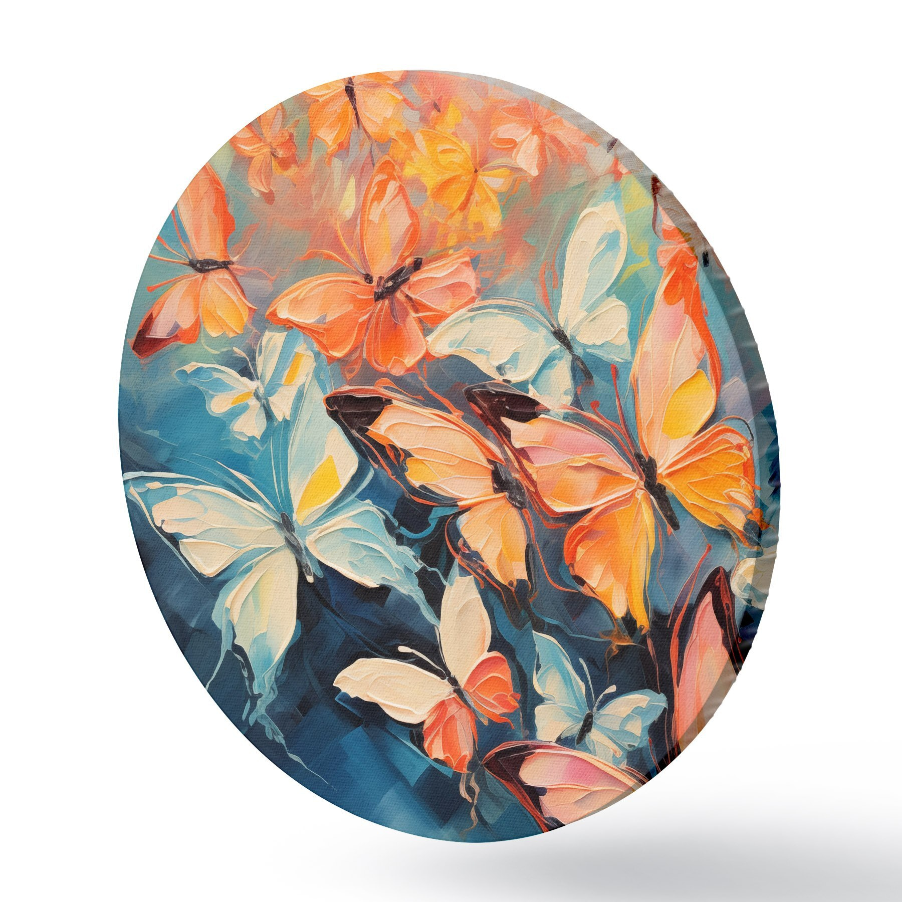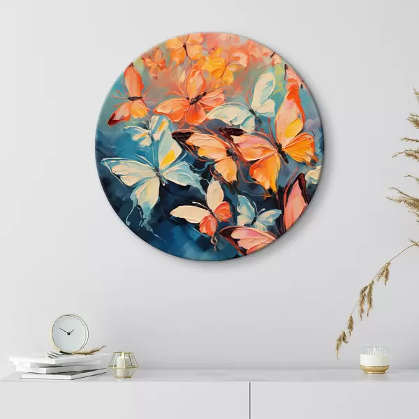 Quadri rotondi Uno stormo di farfalle che volano su un dipinto ad olio blu r39922