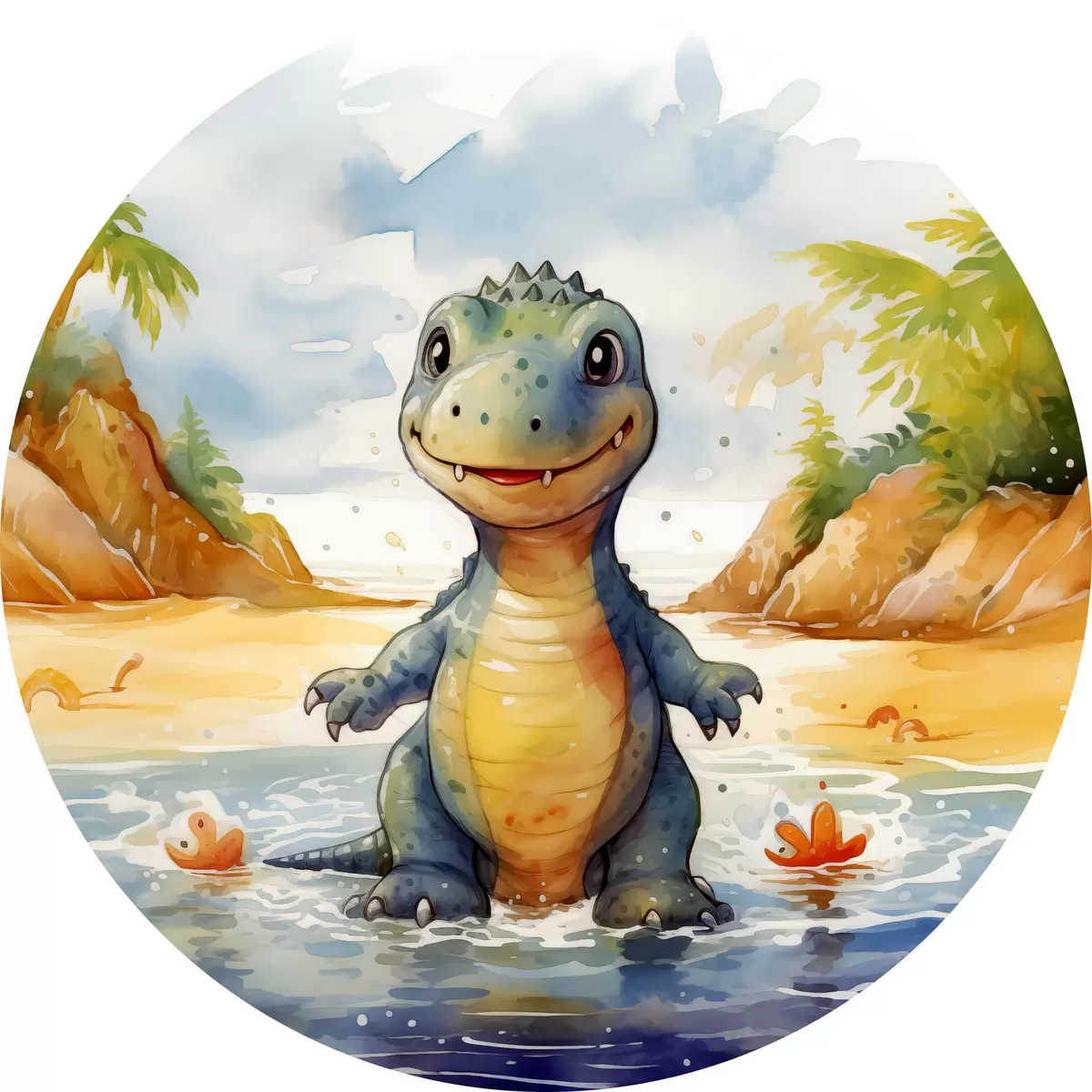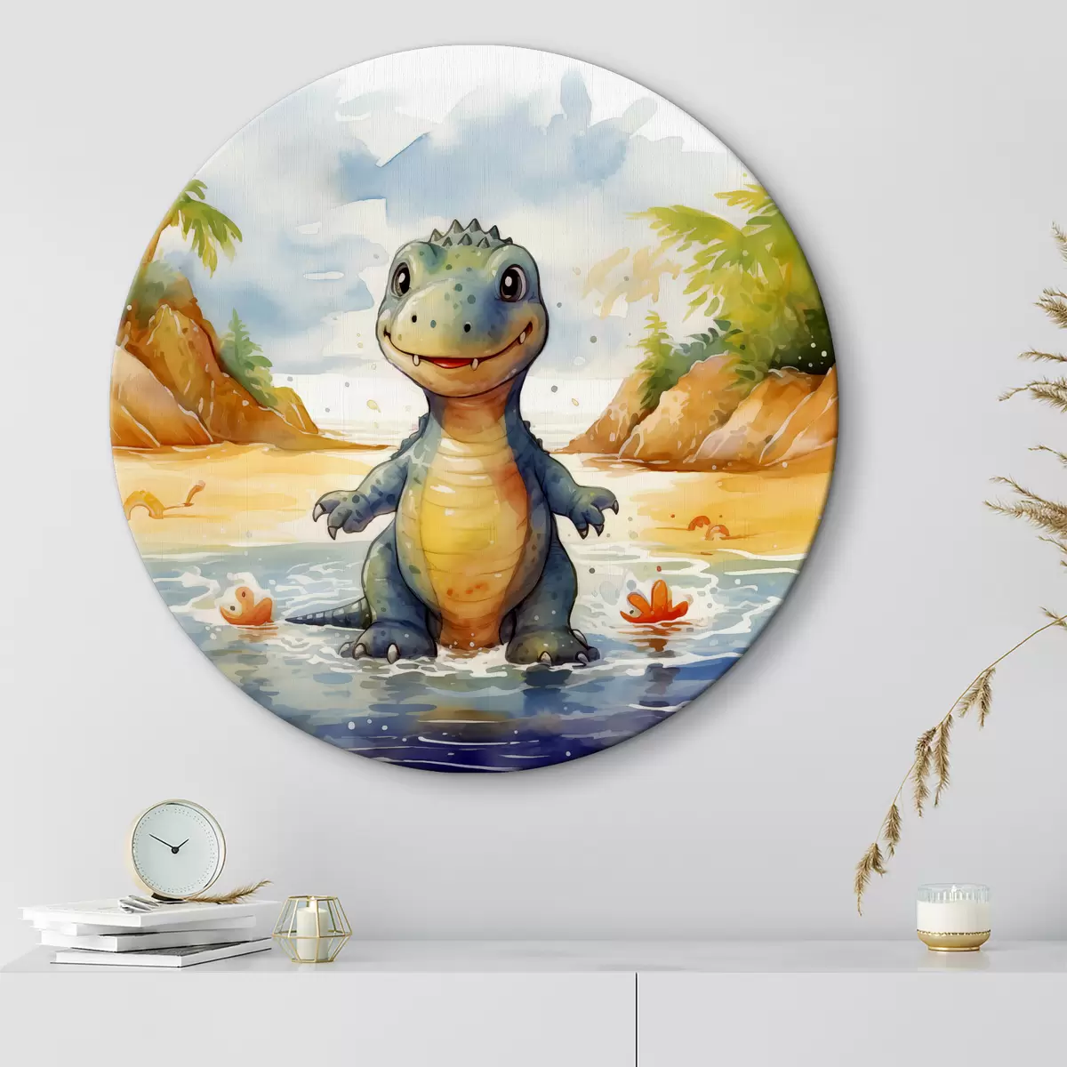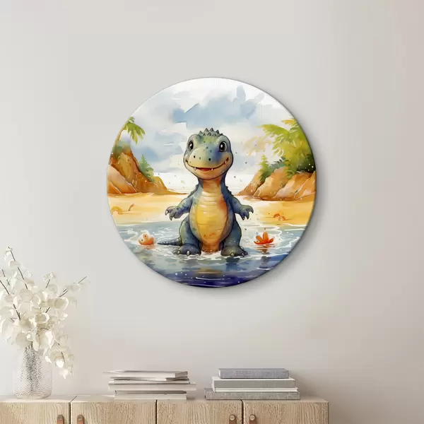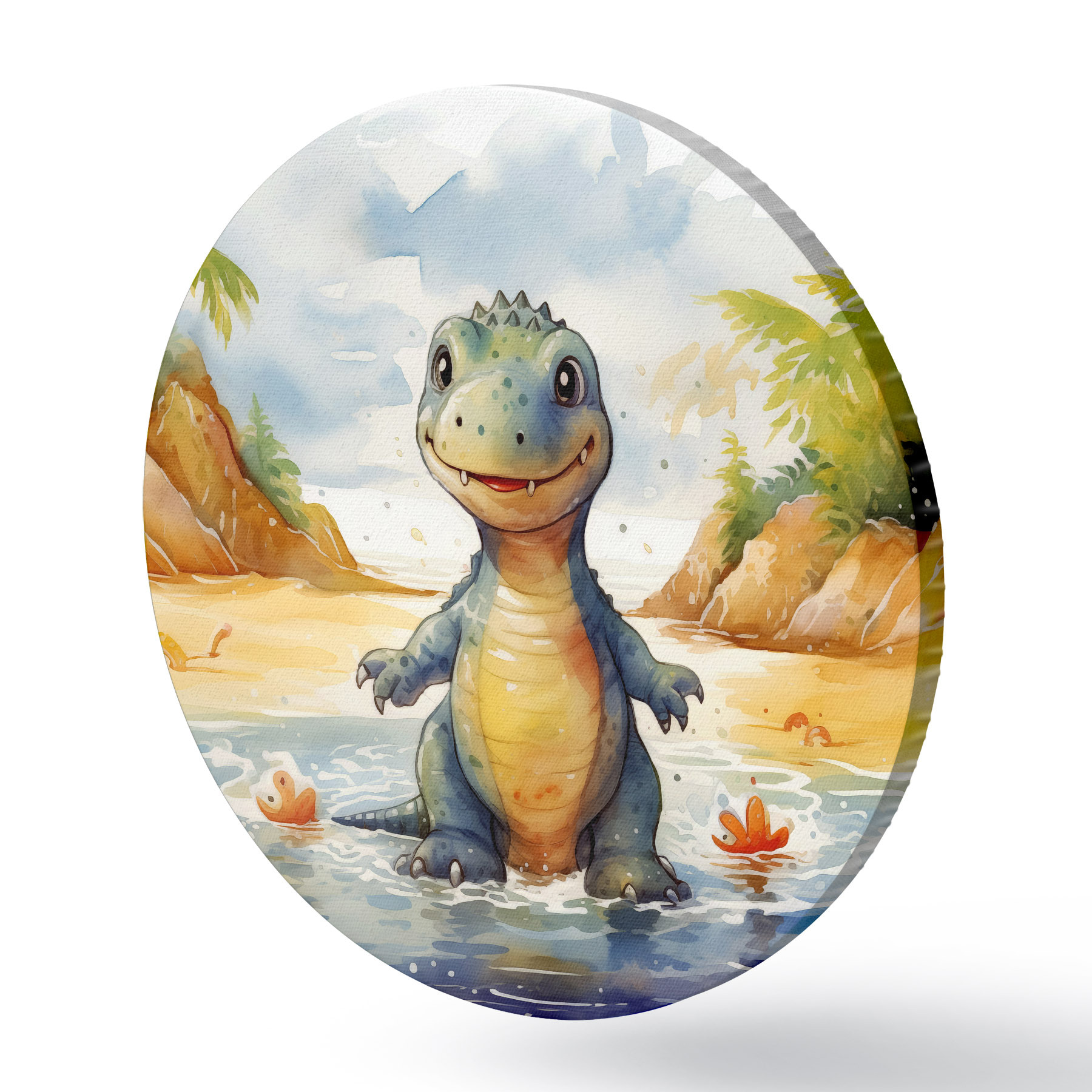 Quadri rotondi Dinosauro nel fiume sullo sfondo di montagne e felci acquerello r39930