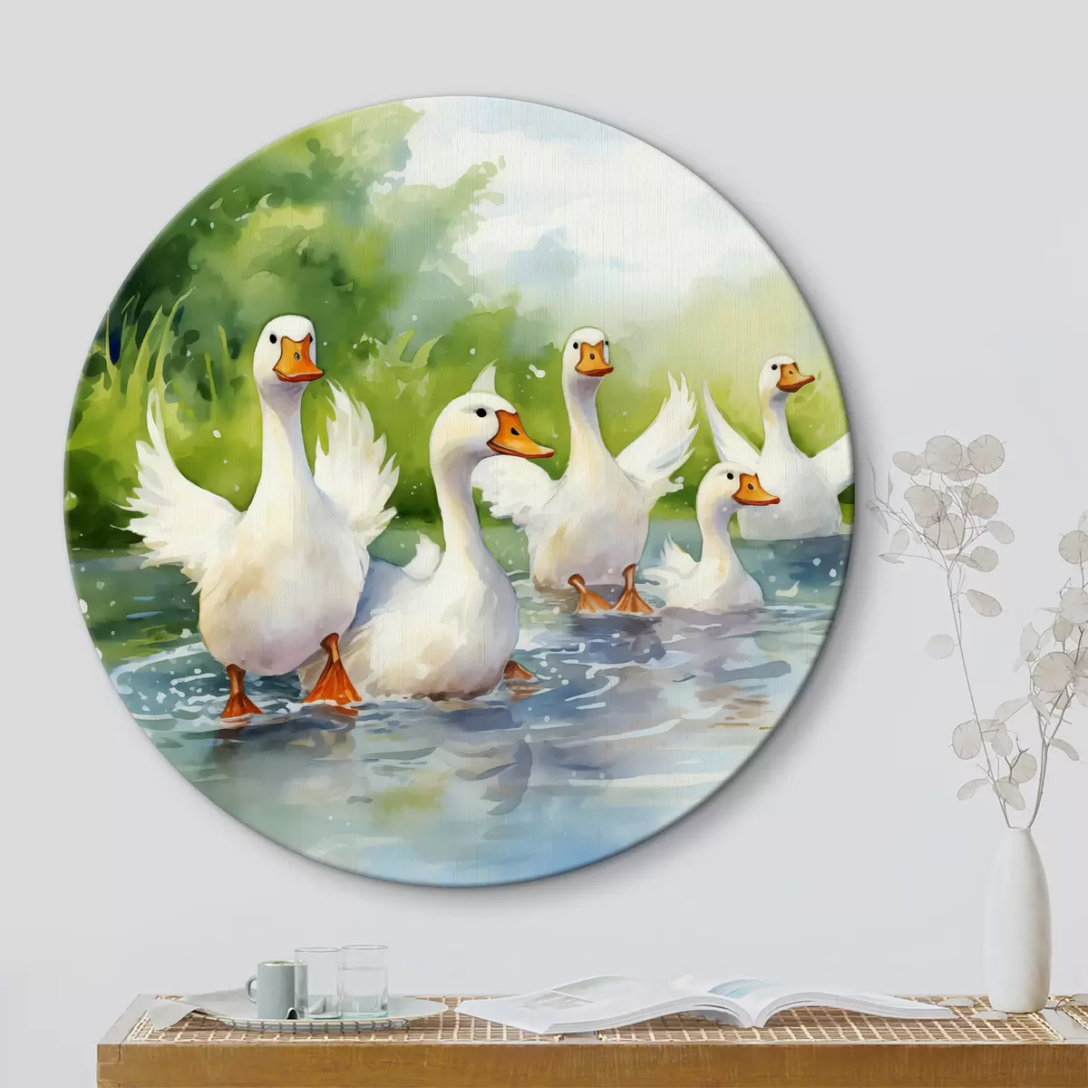 Quadri rotondi Oche bianche che fanno il bagno in uno stagno dipinto ad acquerello r39939