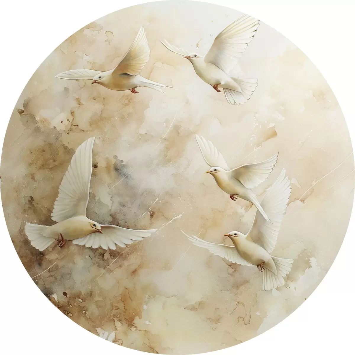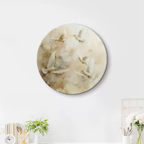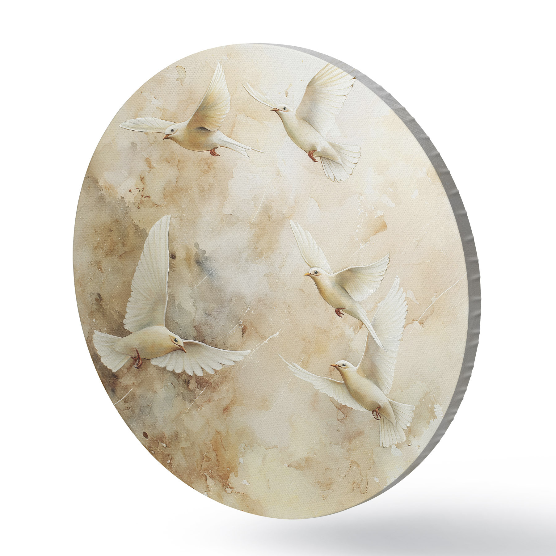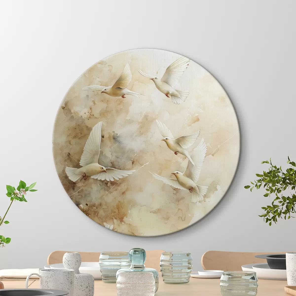 Quadri rotondi Piccioni volanti acquerellati, colori tenui beige e bianco r39977