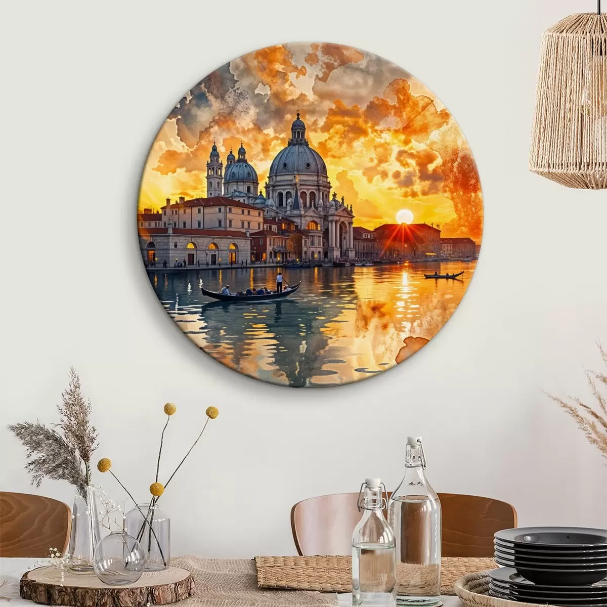 Quadri rotondi Un tramonto colorato e spettacolare sul Canal Grande a Venezia, Italia, acquerello r40027