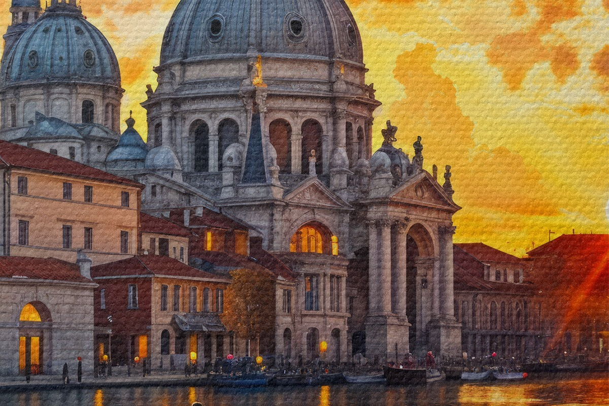 Immagine Un tramonto colorato e spettacolare sul Canal Grande a Venezia, Italia, acquerello Nr r40027