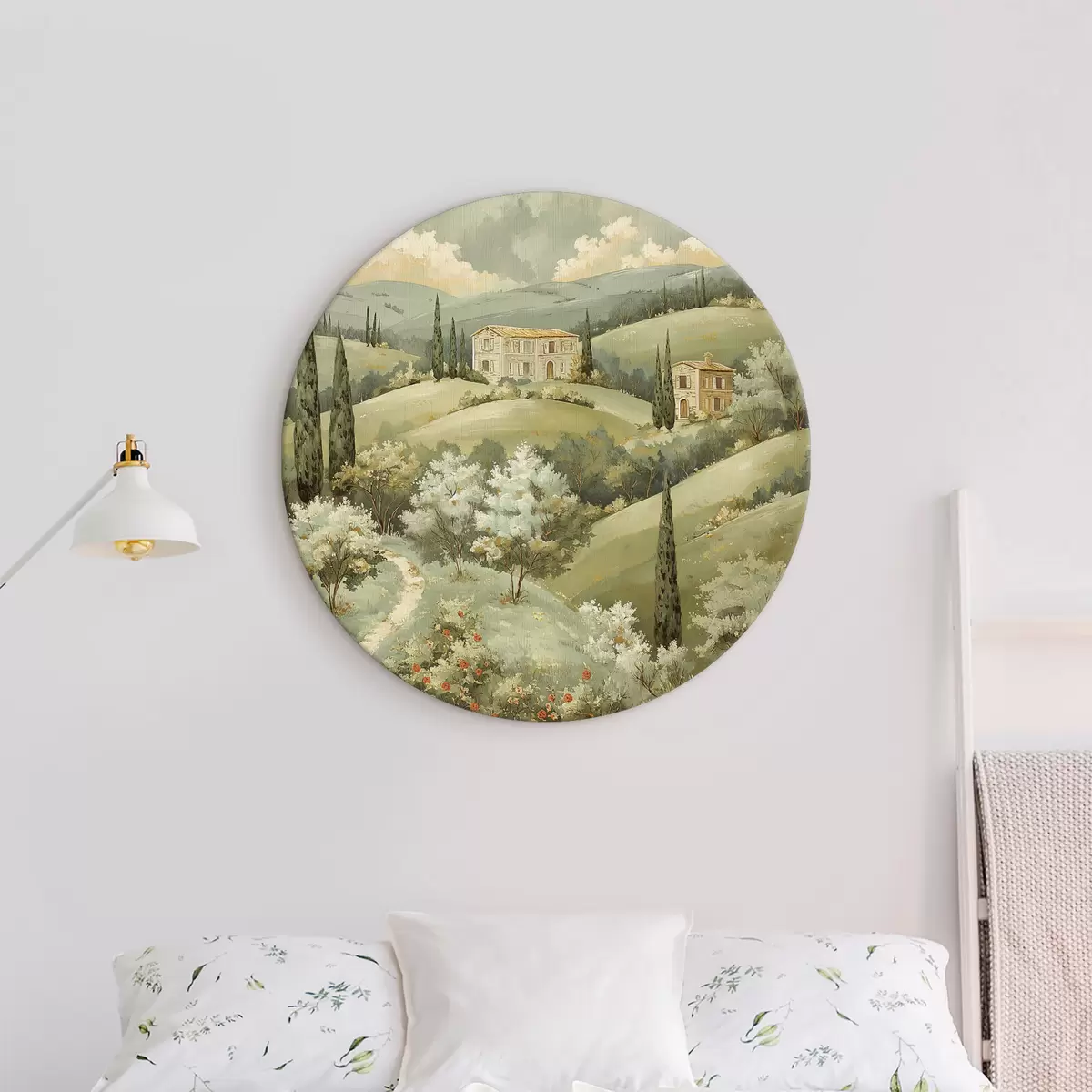Quadri rotondi Paesaggio con case d'epoca, colori verde pastello, disegno acrilico, estate r40078