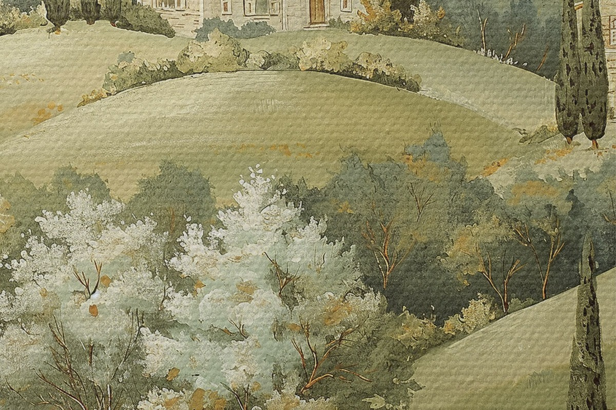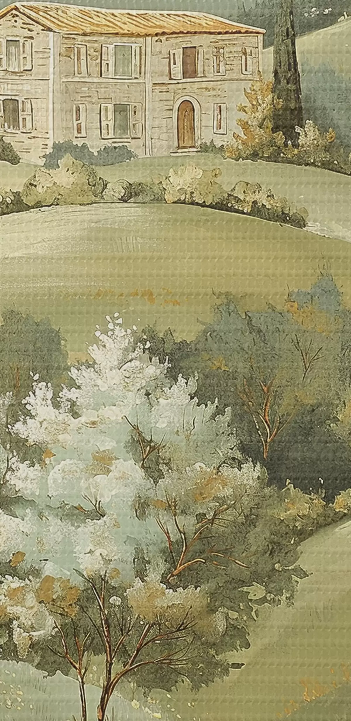 Immagine Paesaggio con case d'epoca, colori verde pastello, disegno acrilico, estate Nr r40078