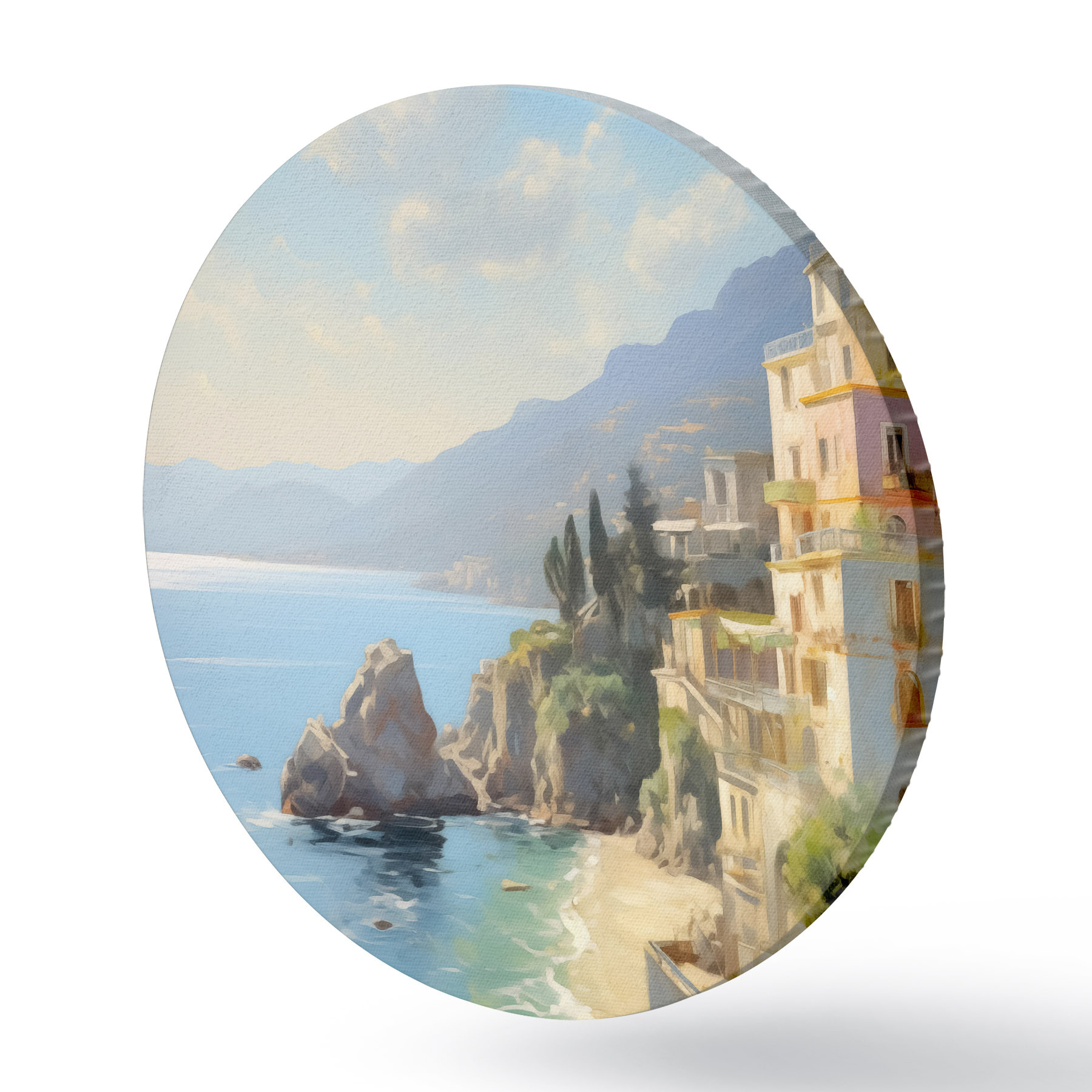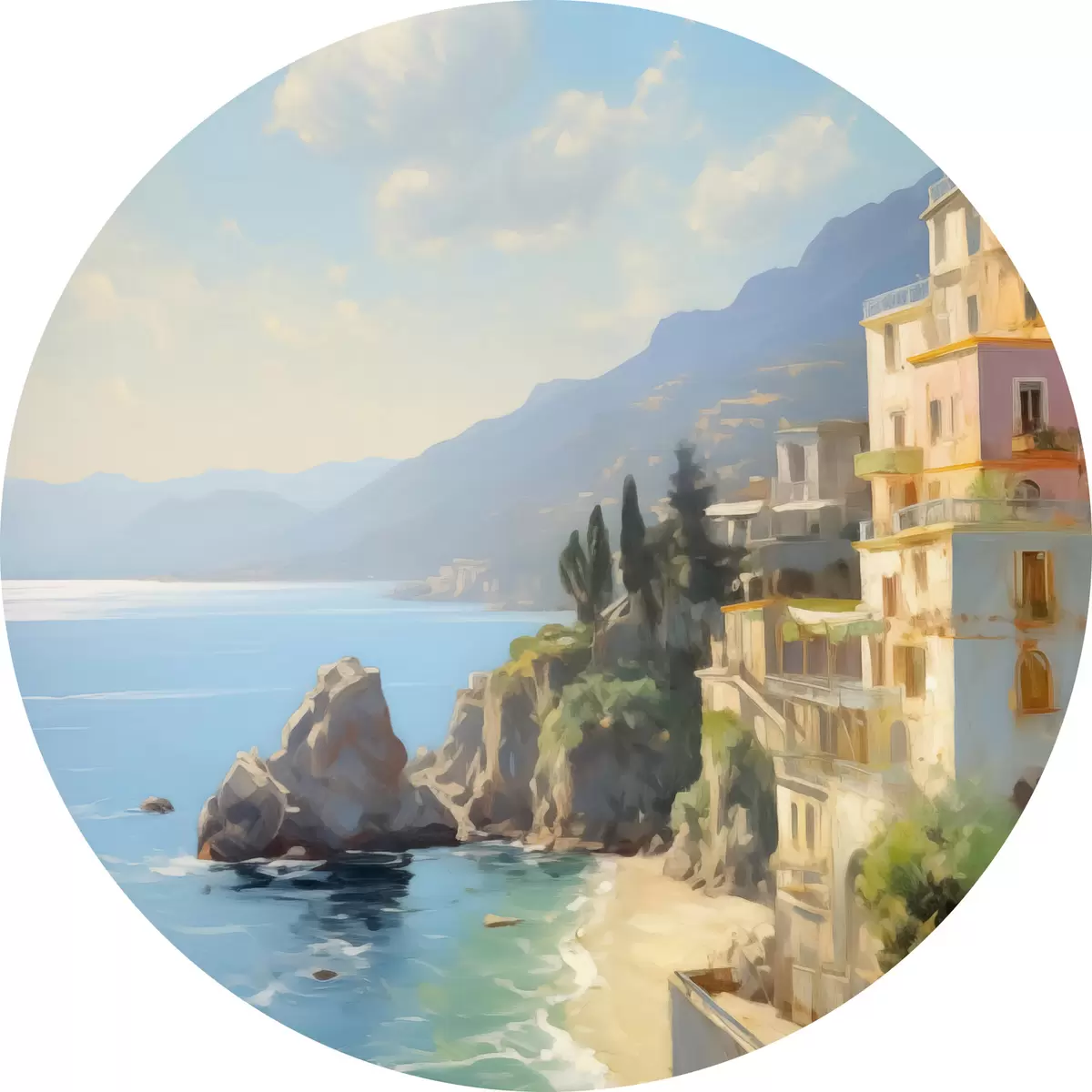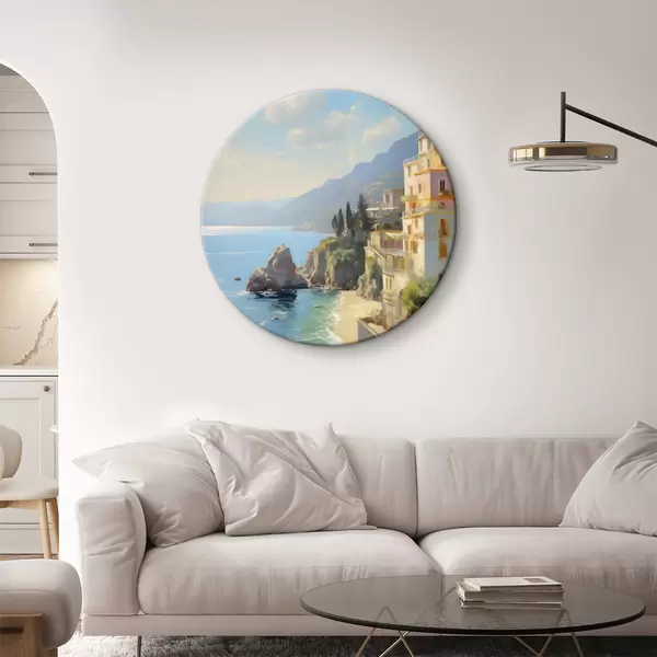 Quadri rotondi Vista della baia del mare, montagne in Italia dall'hotel imitazione della pittura a olio r40088