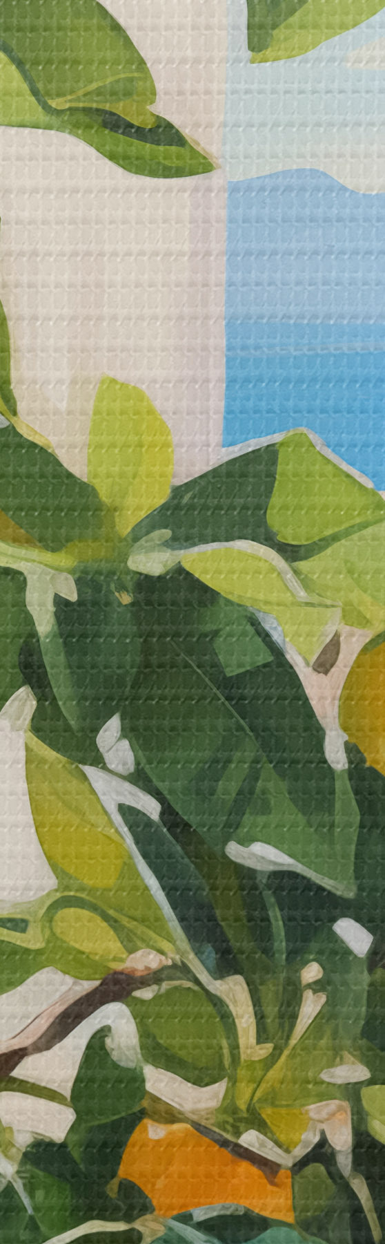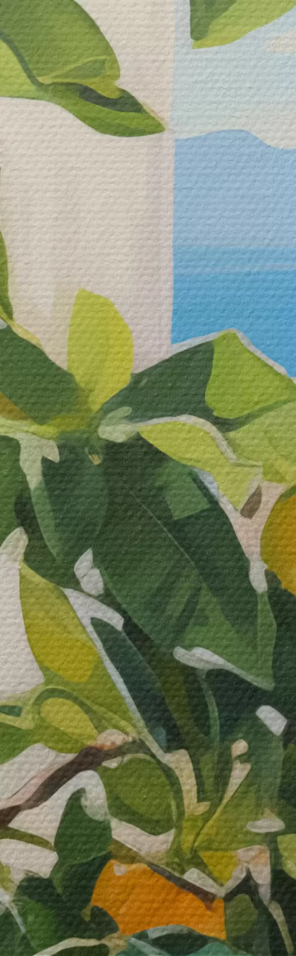 Immagine Limoni su albero e tavolo sul balcone dell'hotel con vista mare imitazione pittura a olio Nr r40091