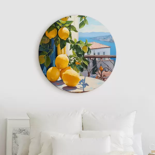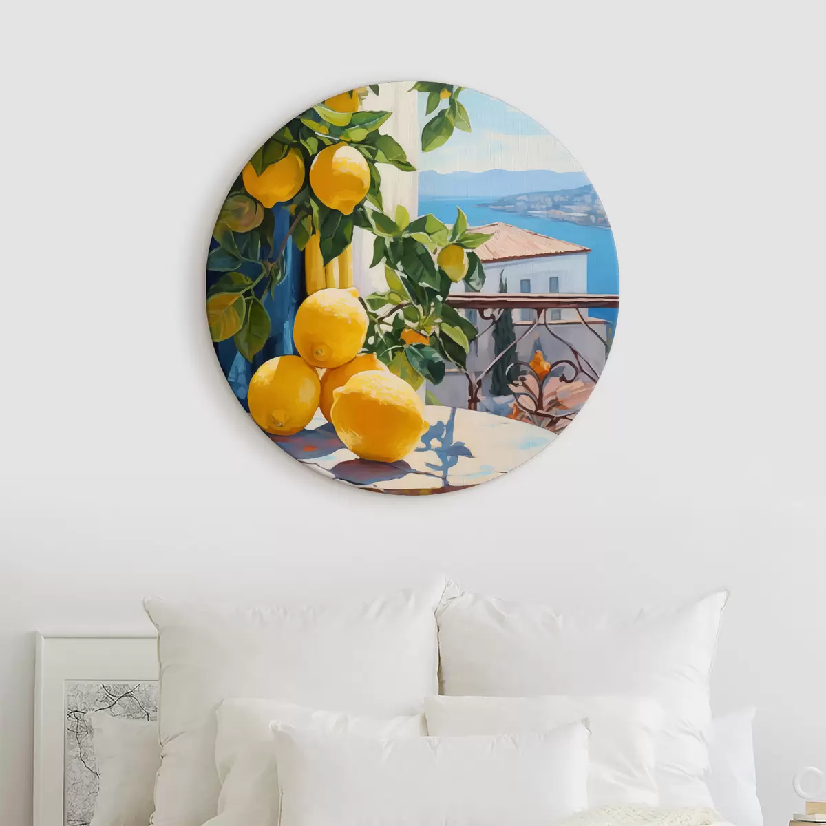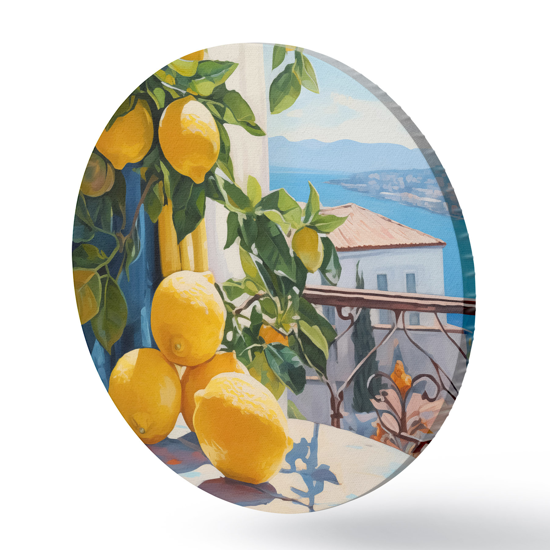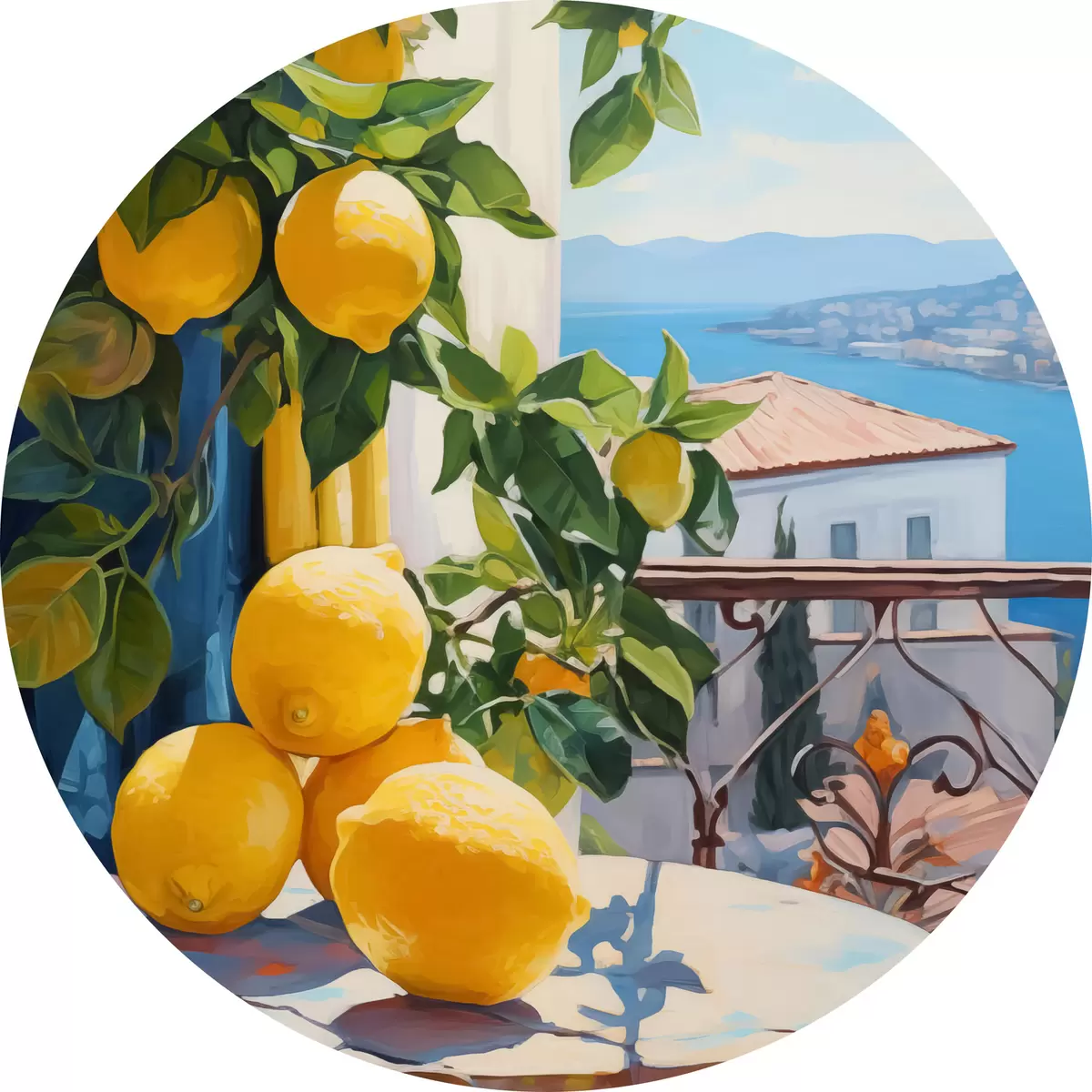 Quadri rotondi Limoni su albero e tavolo sul balcone dell'hotel con vista mare imitazione pittura a olio r40091