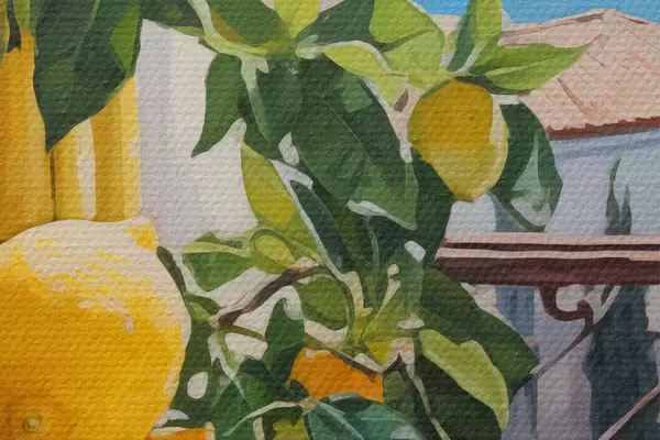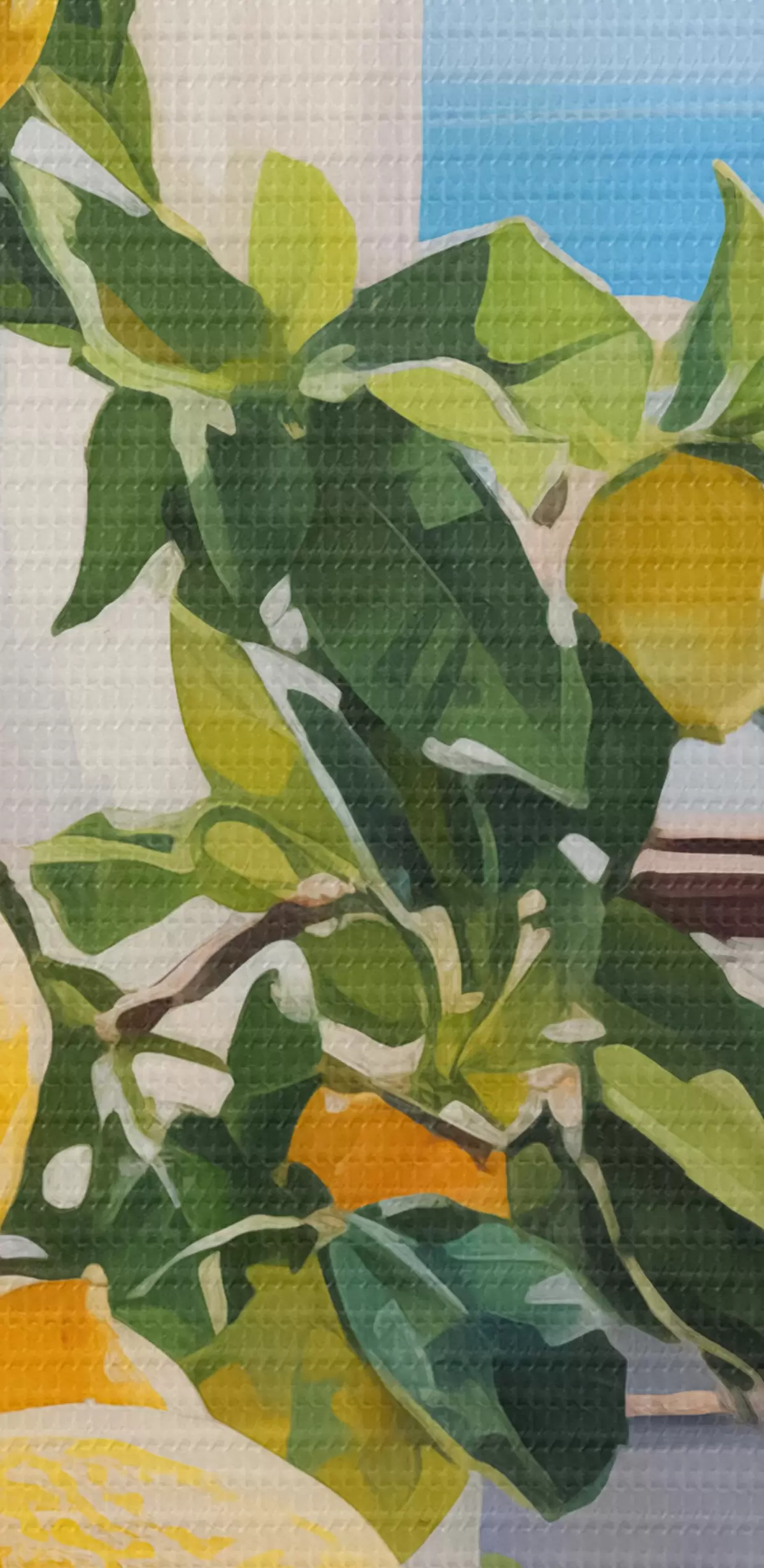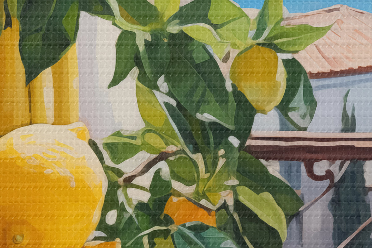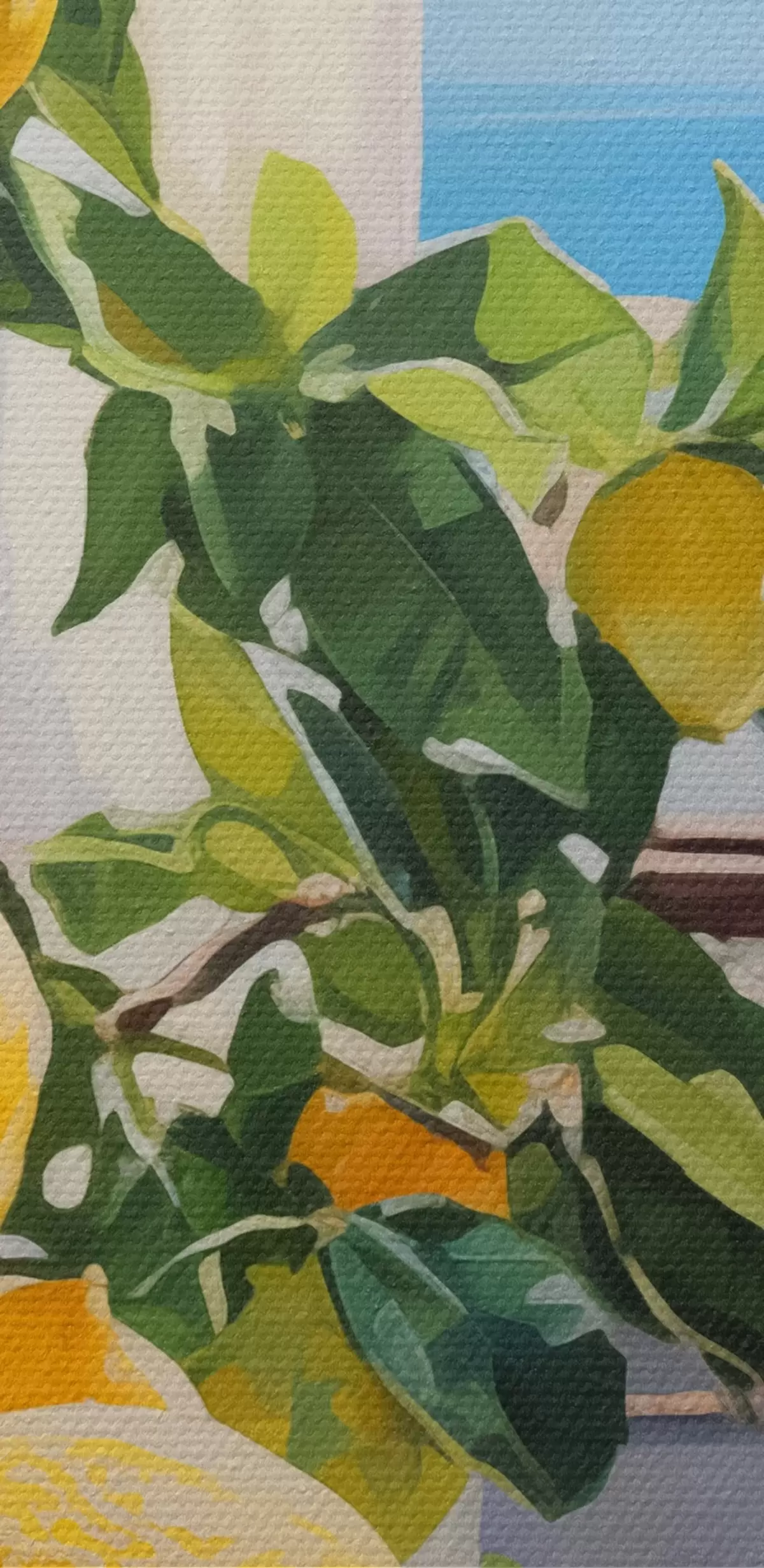 Immagine Limoni su albero e tavolo sul balcone dell'hotel con vista mare imitazione pittura a olio Nr r40091