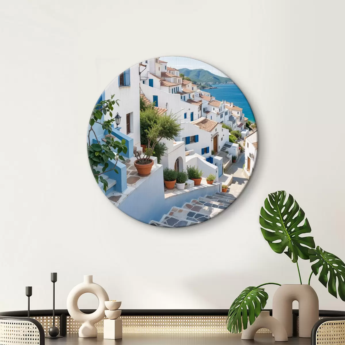 Quadri rotondi Una pittoresca cittadina costiera con edifici bianchi, finestre blu e piante in vaso che costeggiano le strette vie r40148