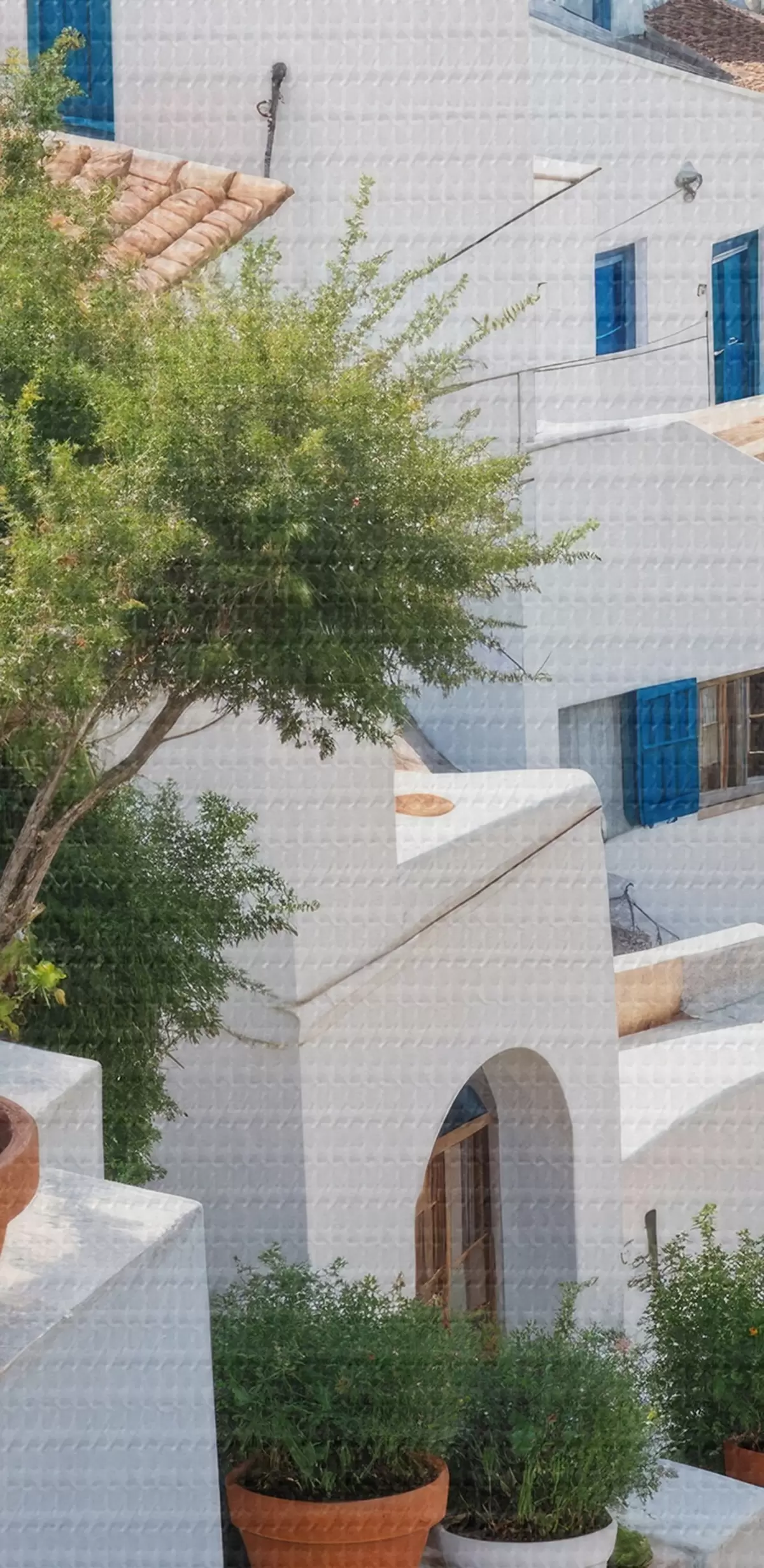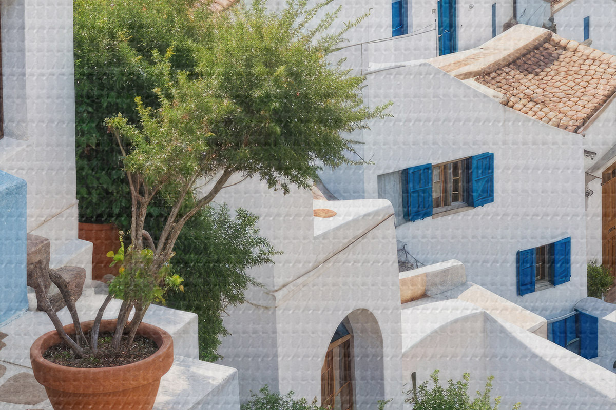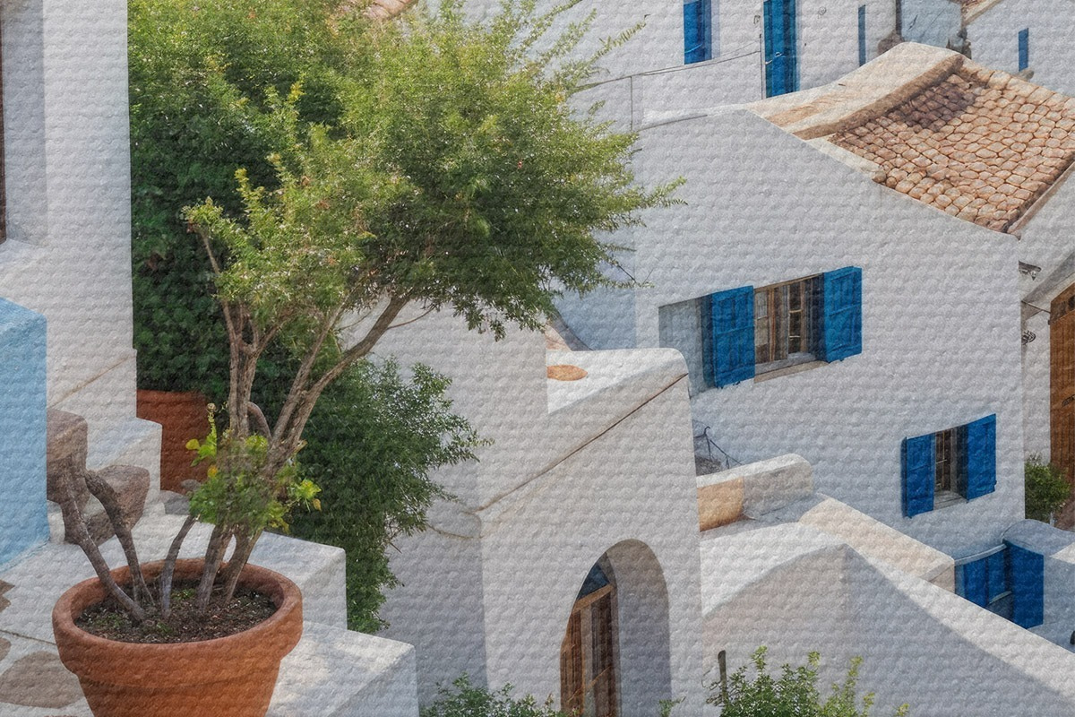 Immagine Una pittoresca cittadina costiera con edifici bianchi, finestre blu e piante in vaso che costeggiano le strette vie Nr r40148