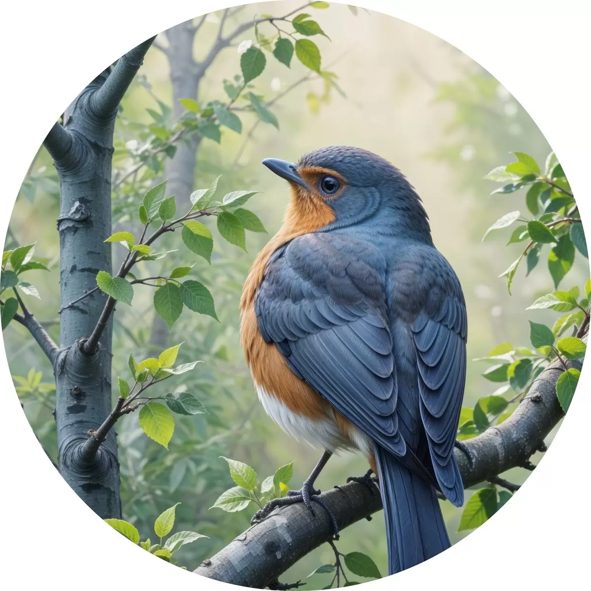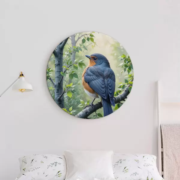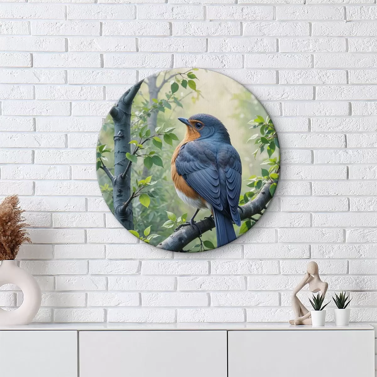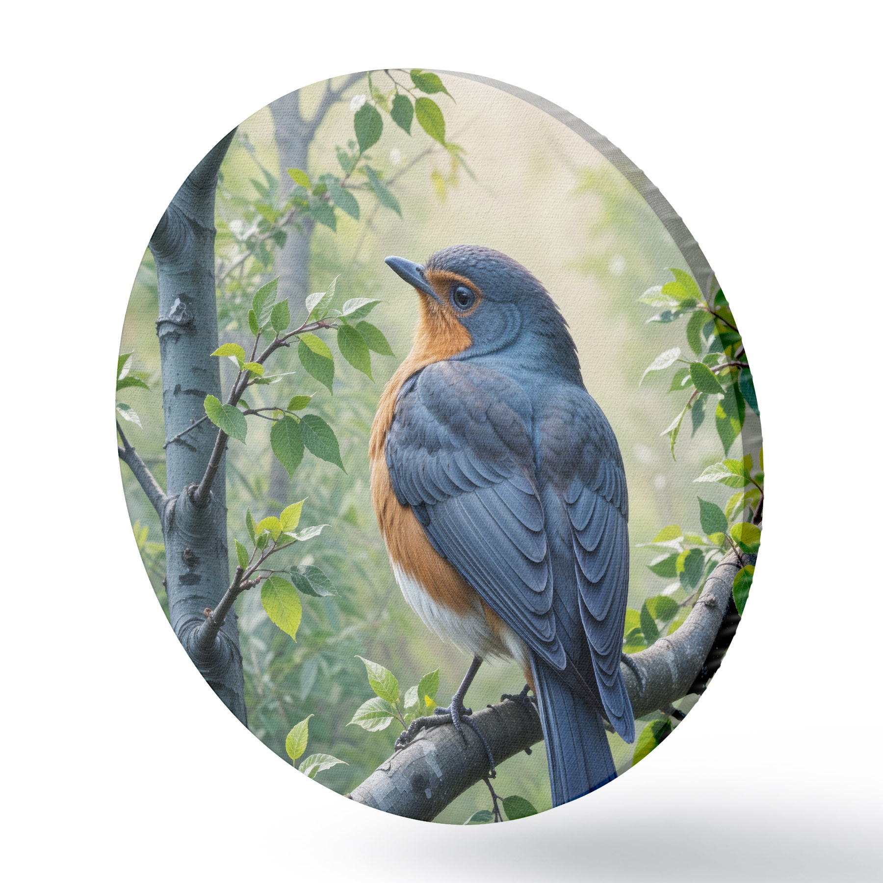 Quadri rotondi Due uccelli blu e arancioni appollaiati su un ramo di un albero con foglie verdi sullo sfondo r40156