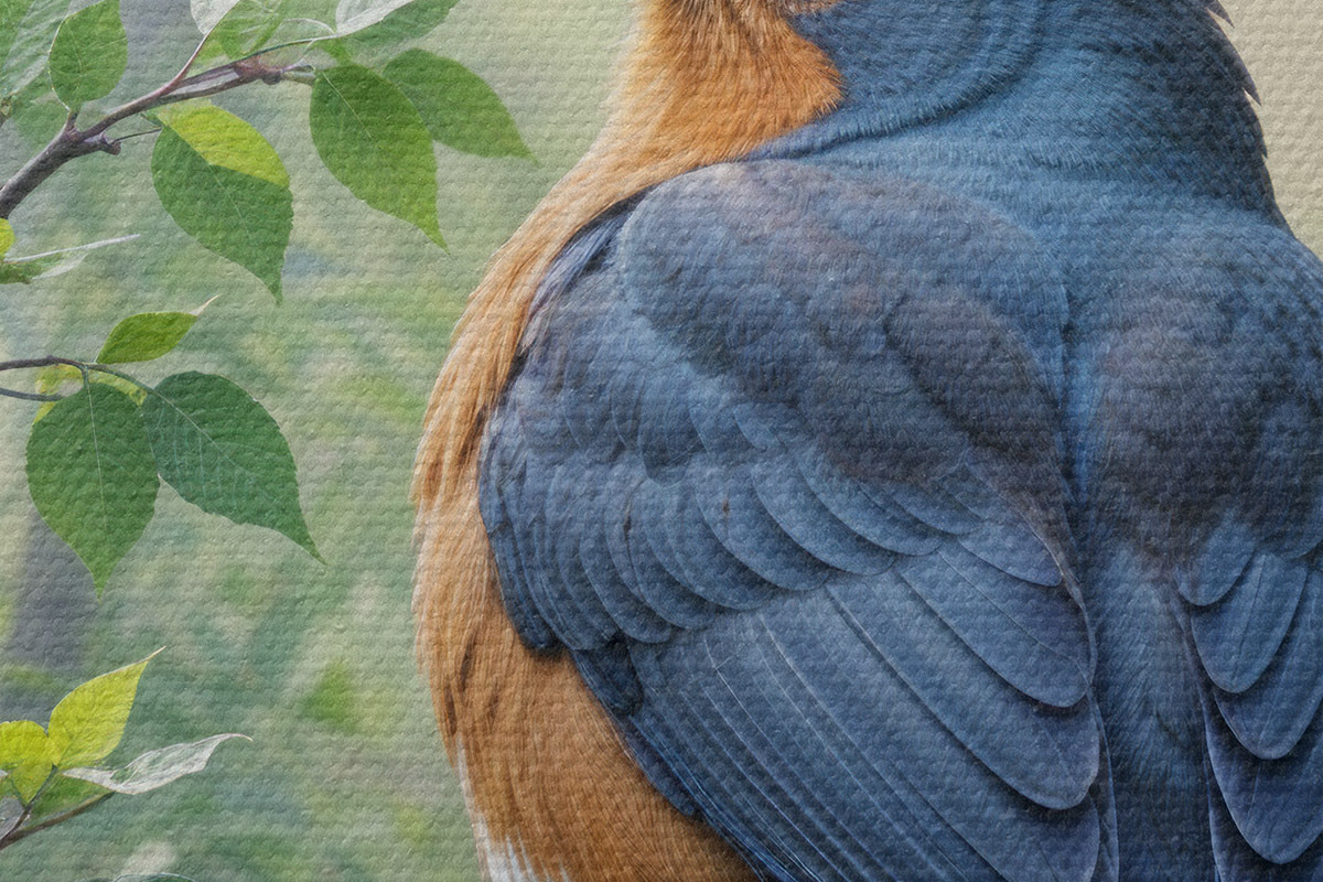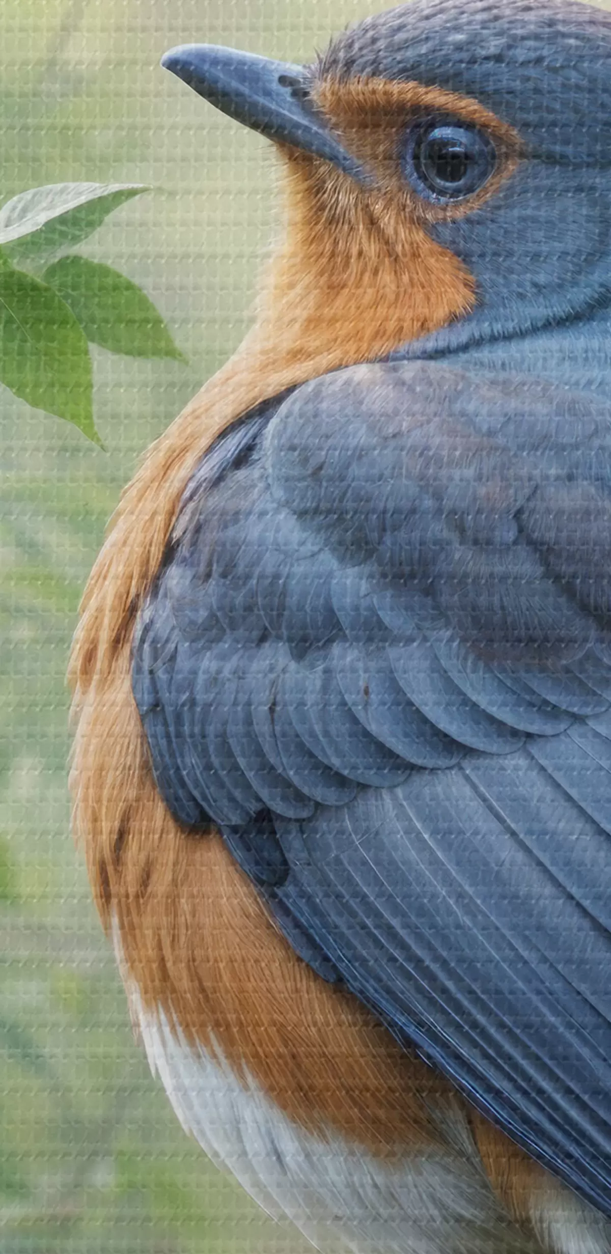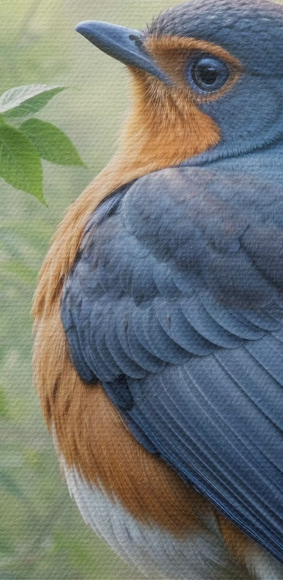 Immagine Due uccelli blu e arancioni appollaiati su un ramo di un albero con foglie verdi sullo sfondo Nr r40156