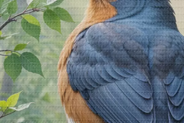 Immagine Due uccelli blu e arancioni appollaiati su un ramo di un albero con foglie verdi sullo sfondo Nr r40156