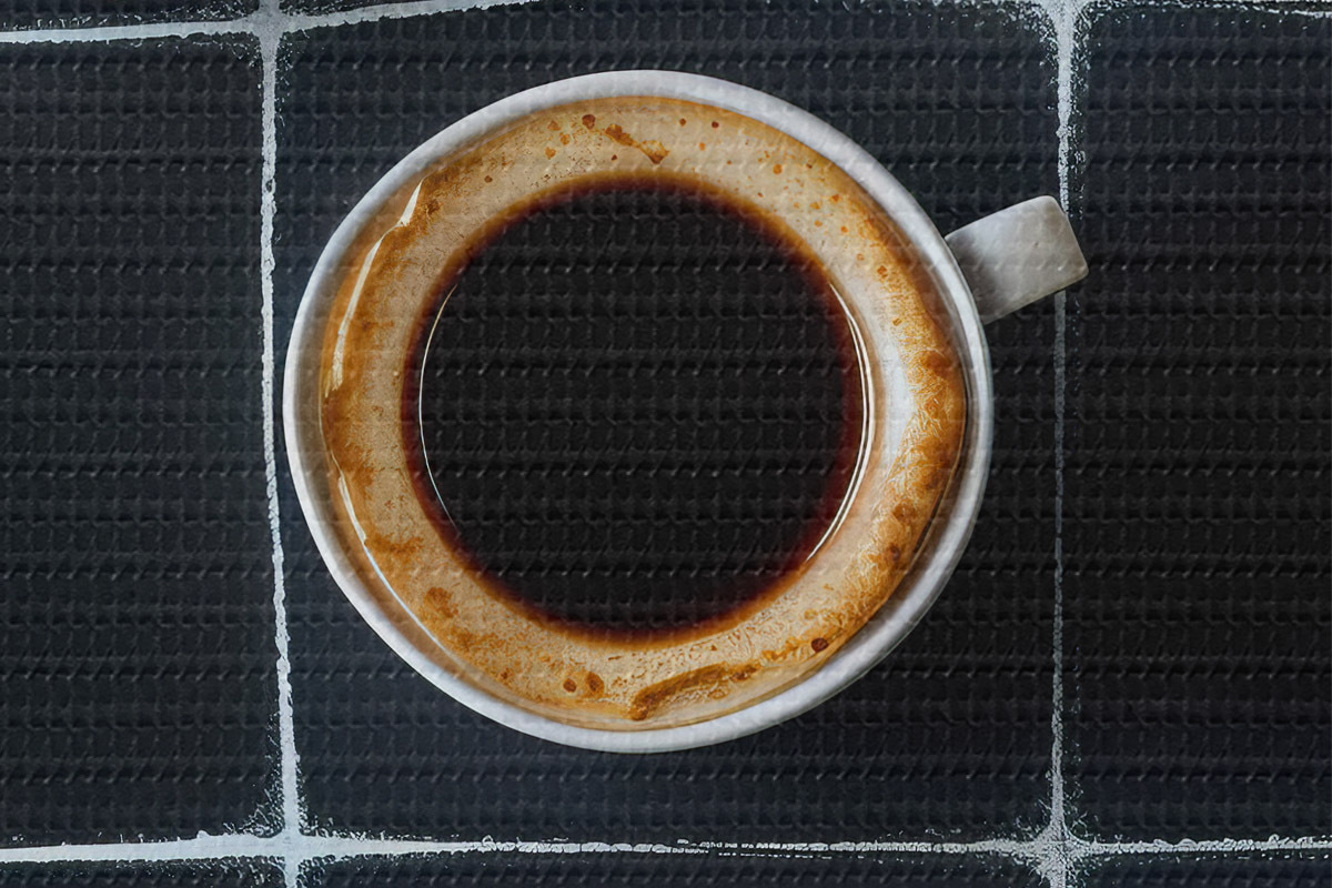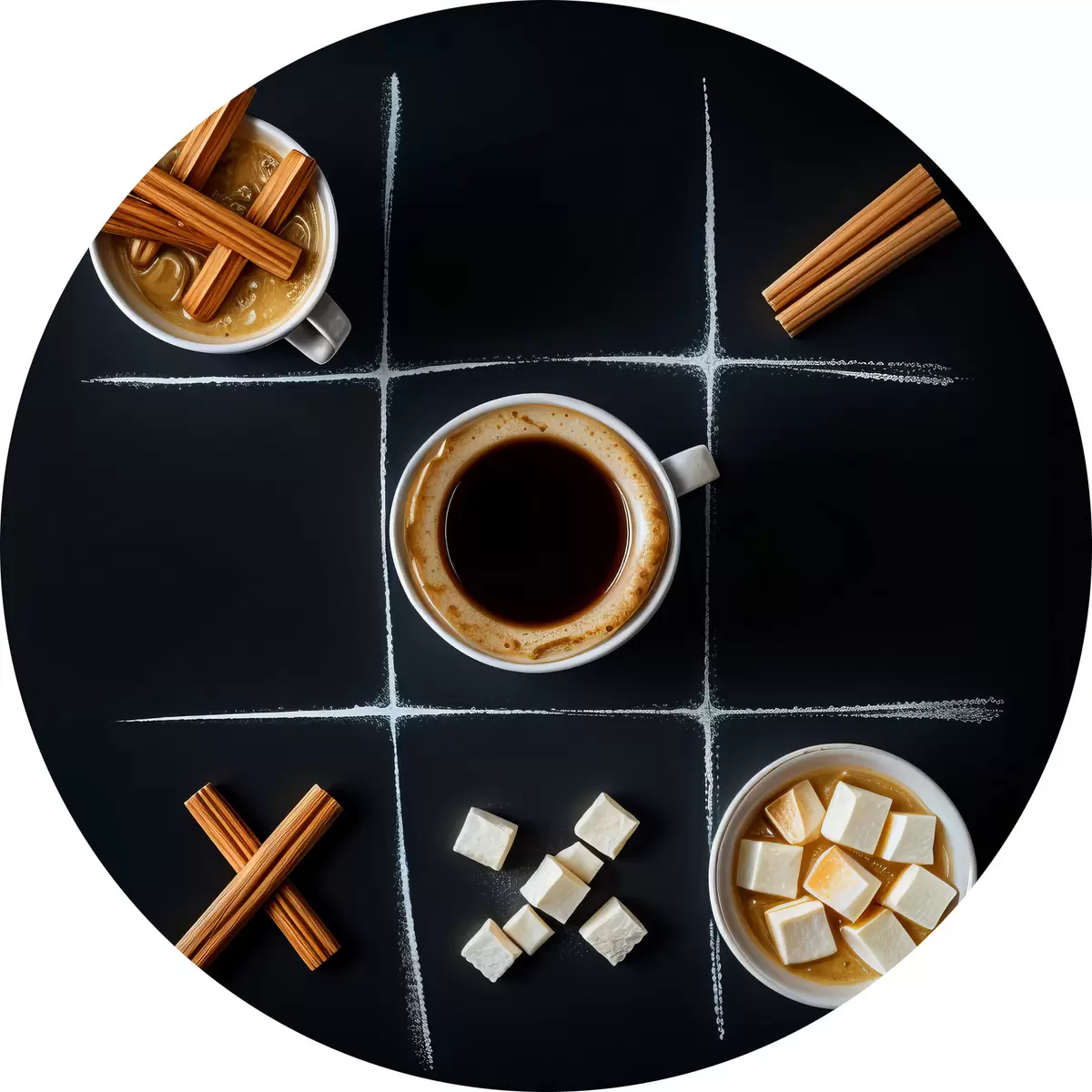 Immagine Una tazza di caffè con bastoncini di cannella, cubetti di zucchero e marshmallow disposti in una griglia del gioco del tris Nr r40163