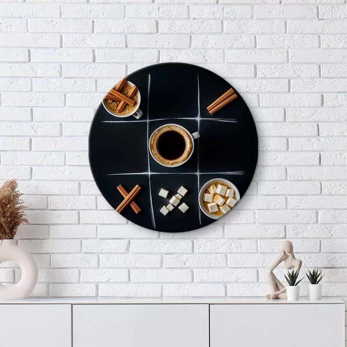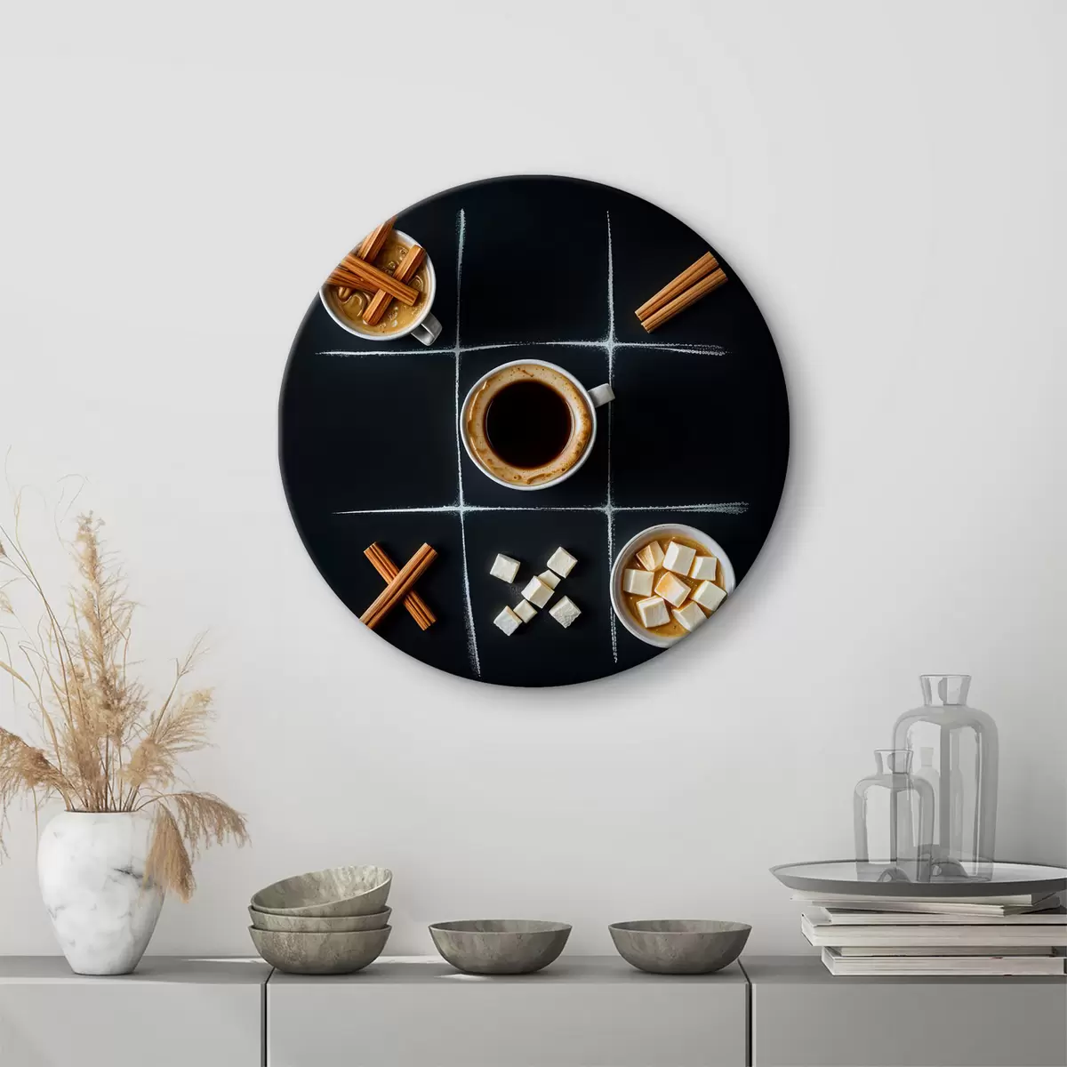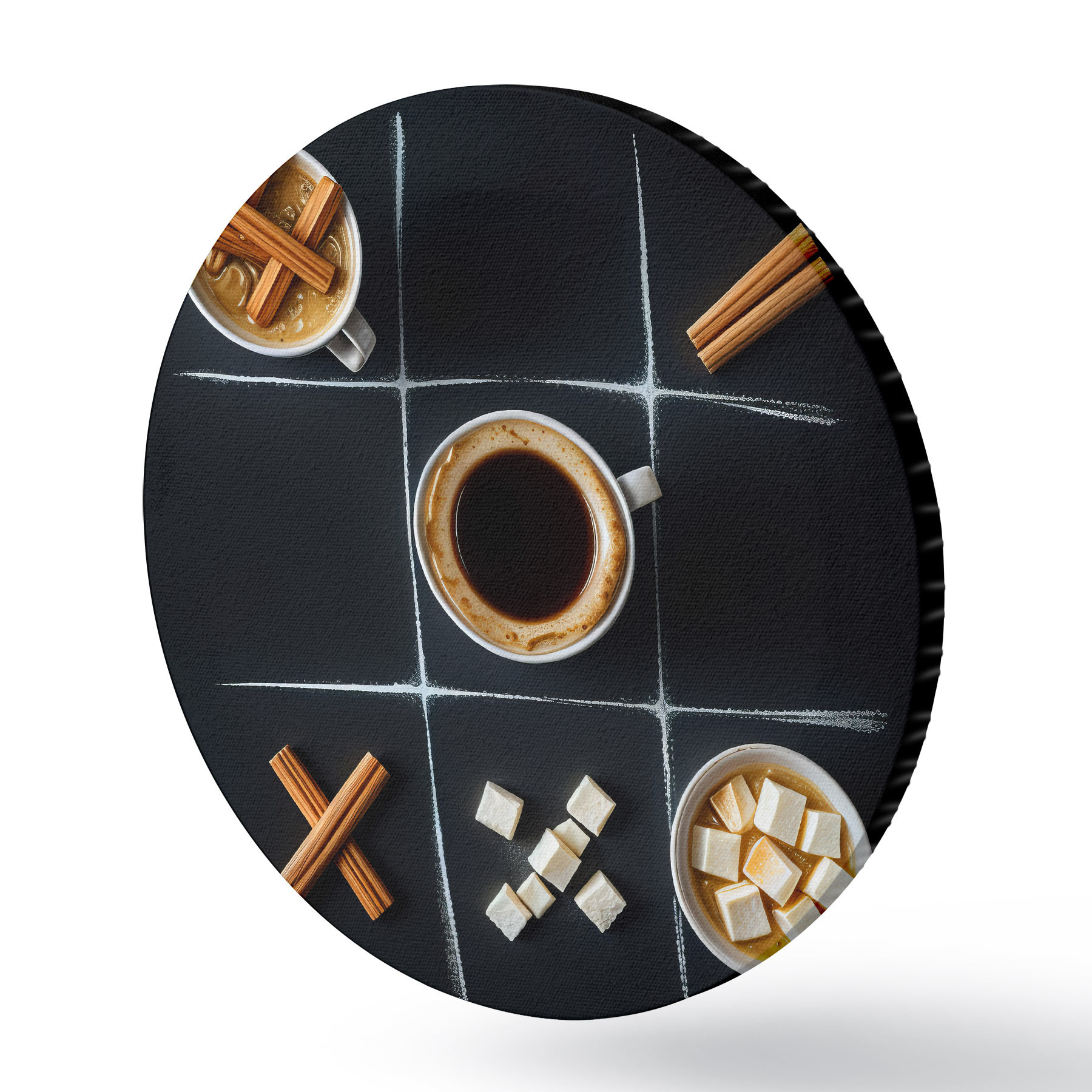 Quadri rotondi Una tazza di caffè con bastoncini di cannella, cubetti di zucchero e marshmallow disposti in una griglia del gioco del tris r40163