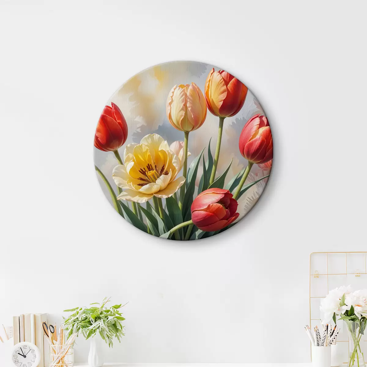 Quadri rotondi Tulipani colorati in varie tonalità di rosso, arancione e giallo su uno sfondo chiaro r40167