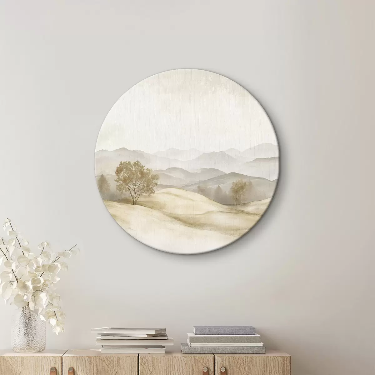 Quadri rotondi Paesaggio naturale in tavolozza di colori beige, prato, alberi, disegno ad acquerello r40231