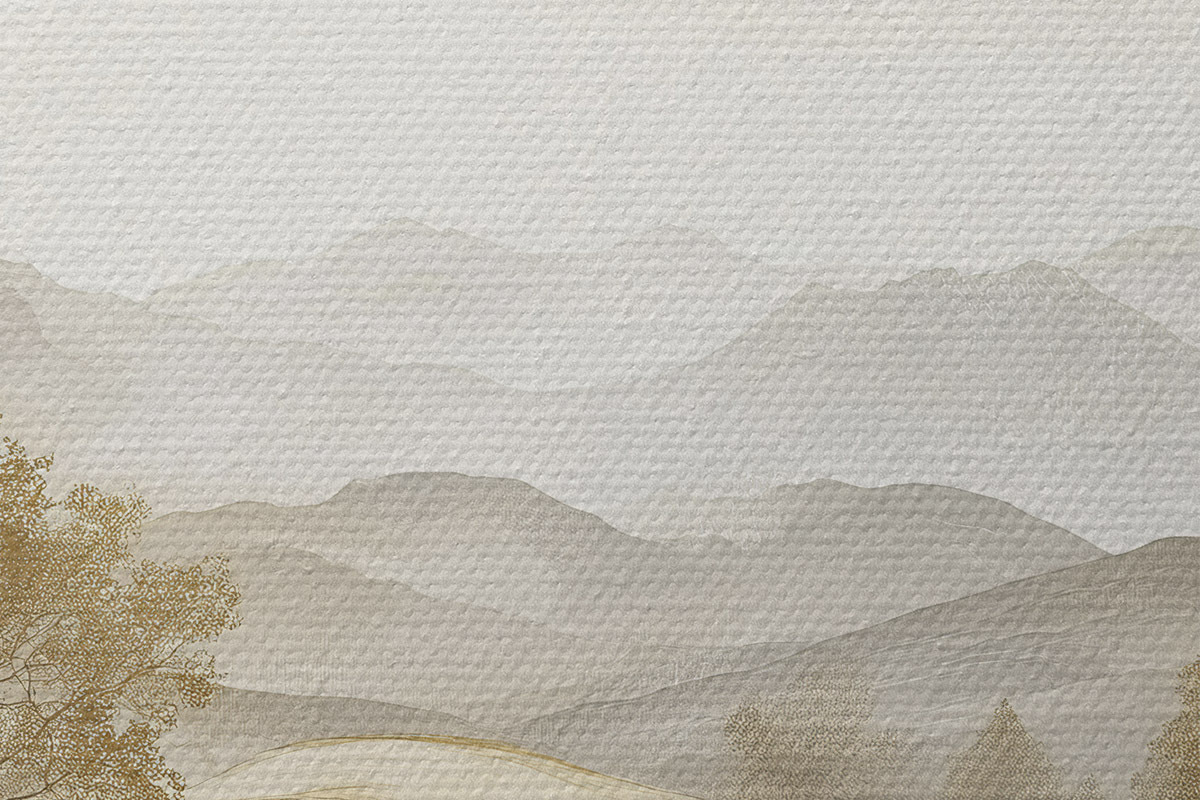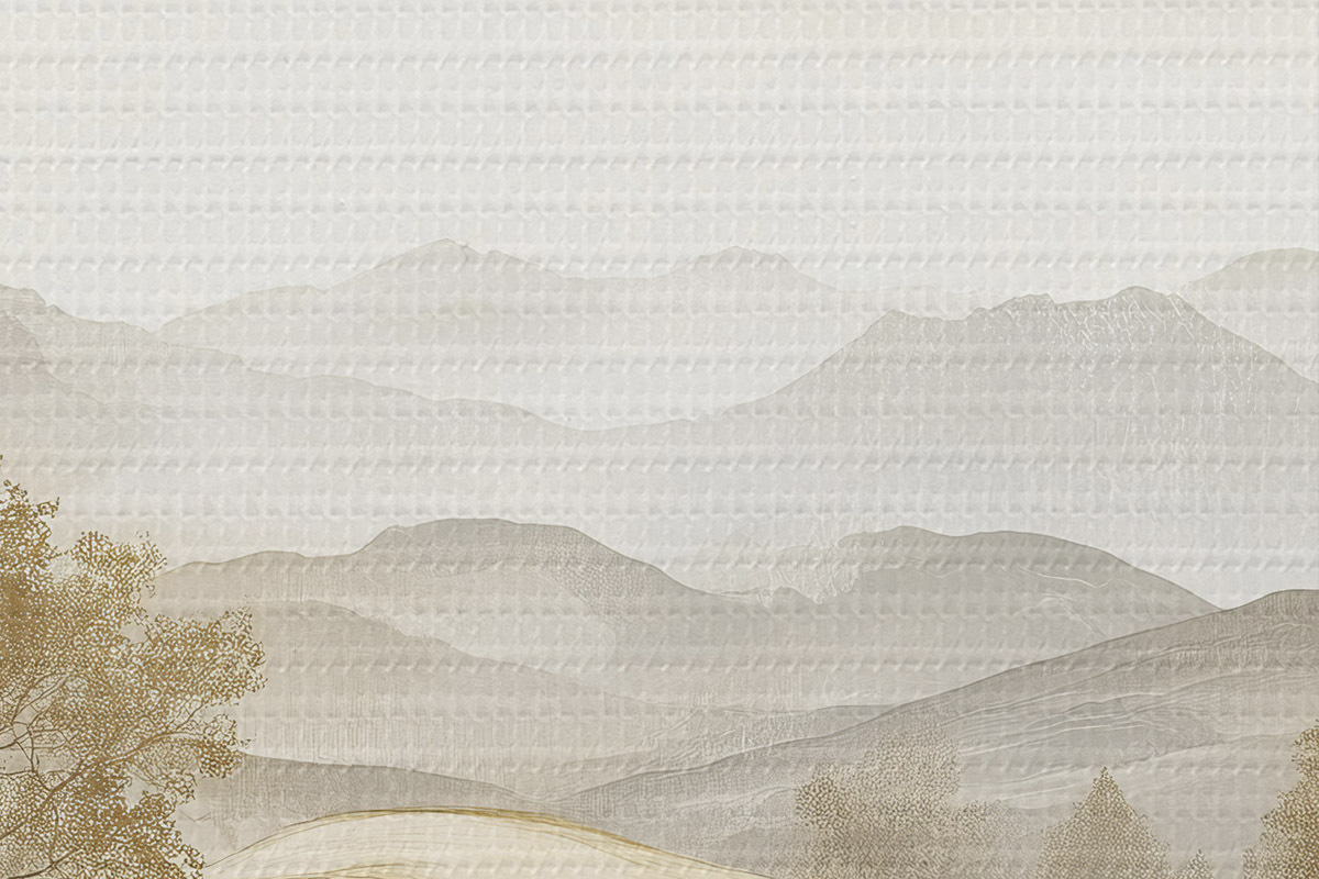 Immagine Paesaggio naturale in tavolozza di colori beige, prato, alberi, disegno ad acquerello Nr r40231