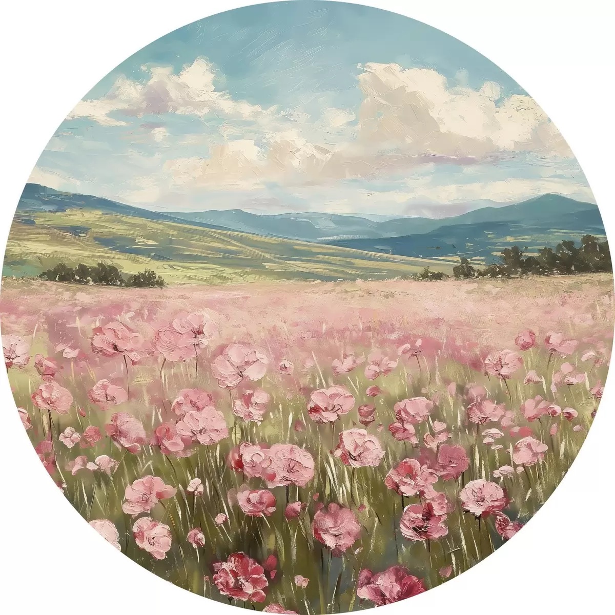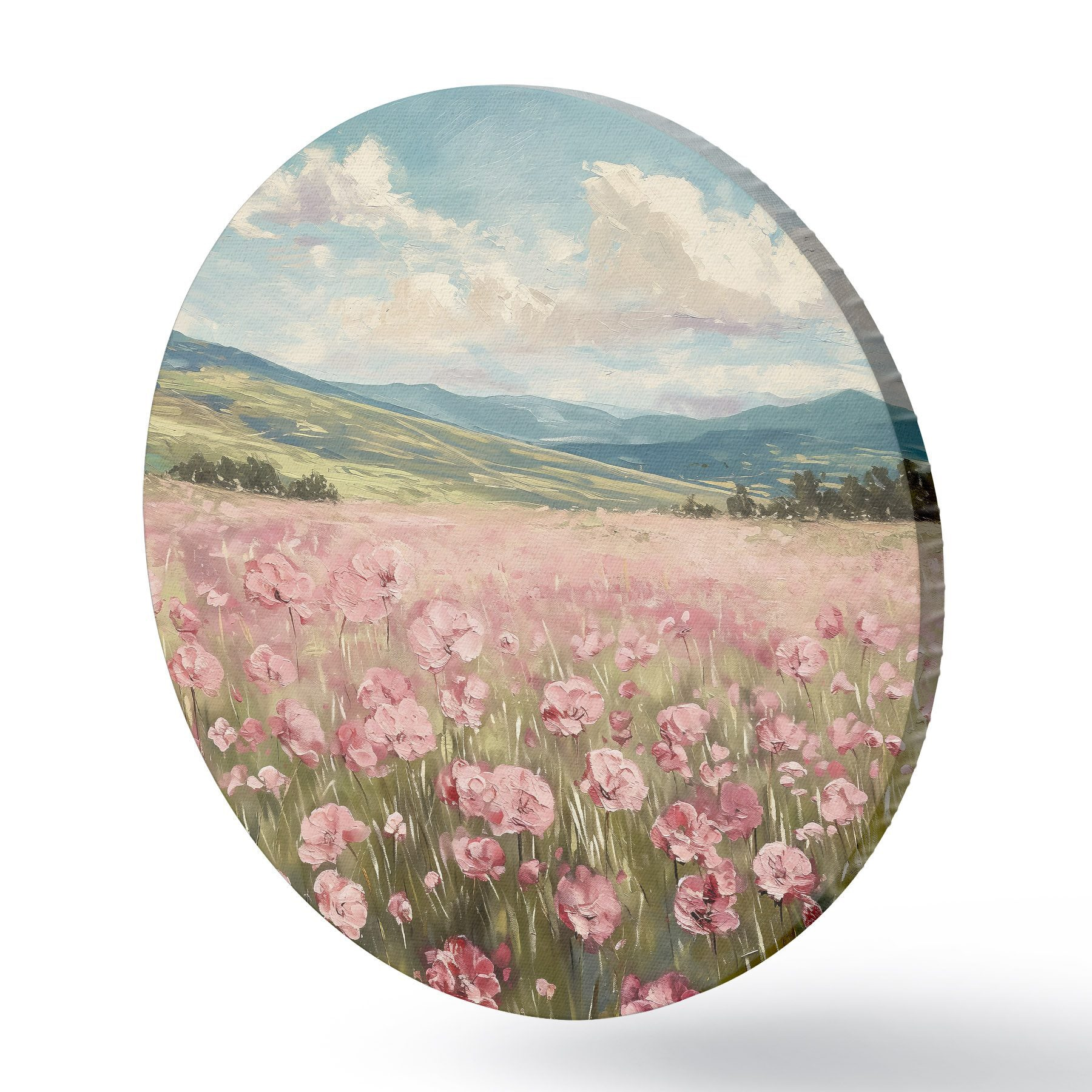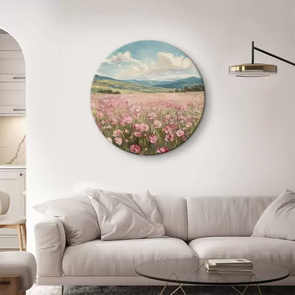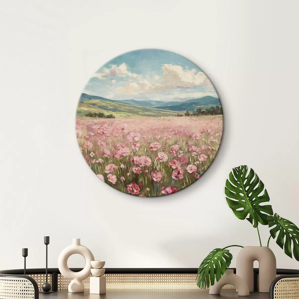 Quadri rotondi Prato con fiori rosa, montagne, paesaggio naturale, cielo azzurro con nuvole, acrilico r40232
