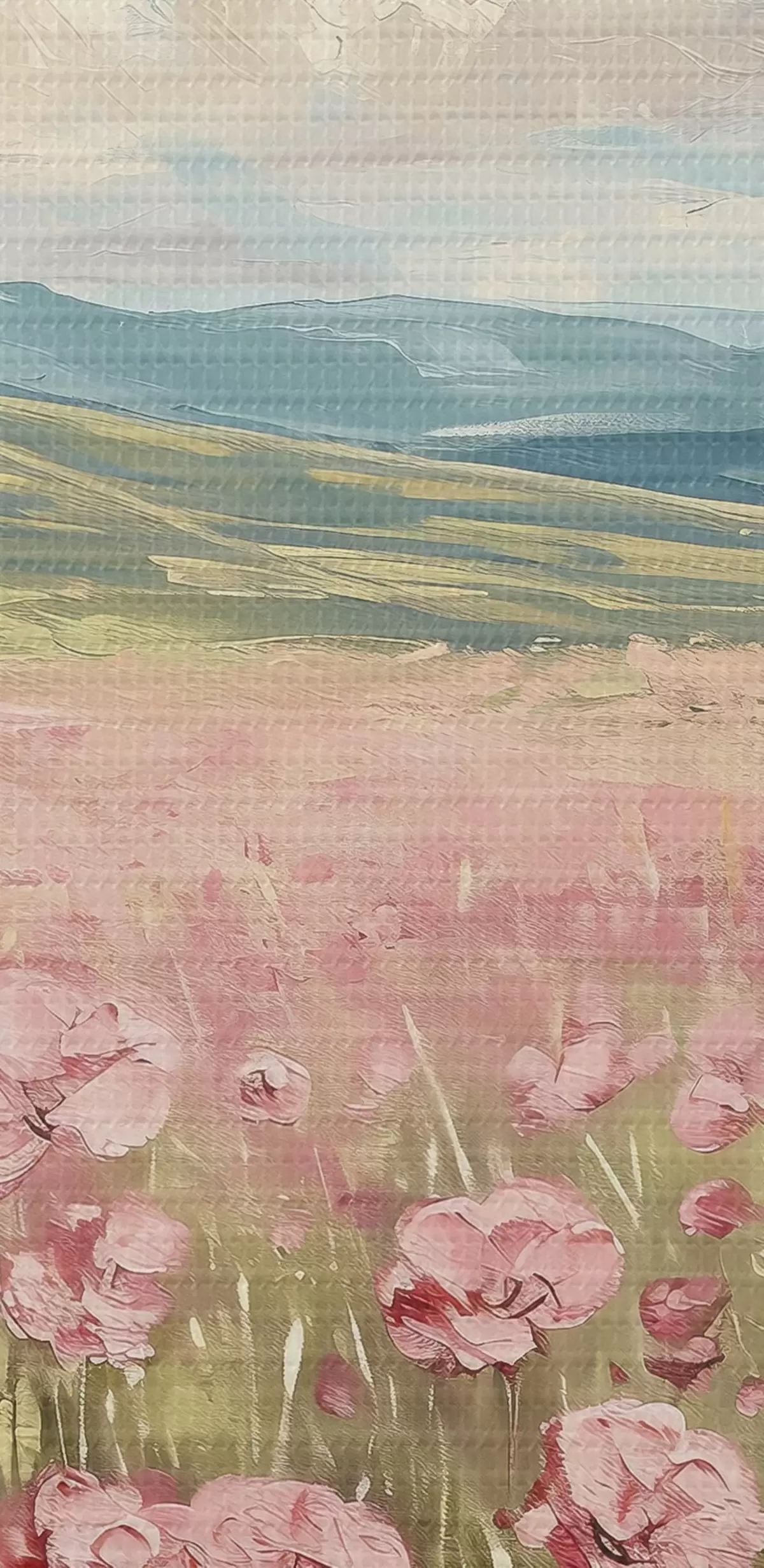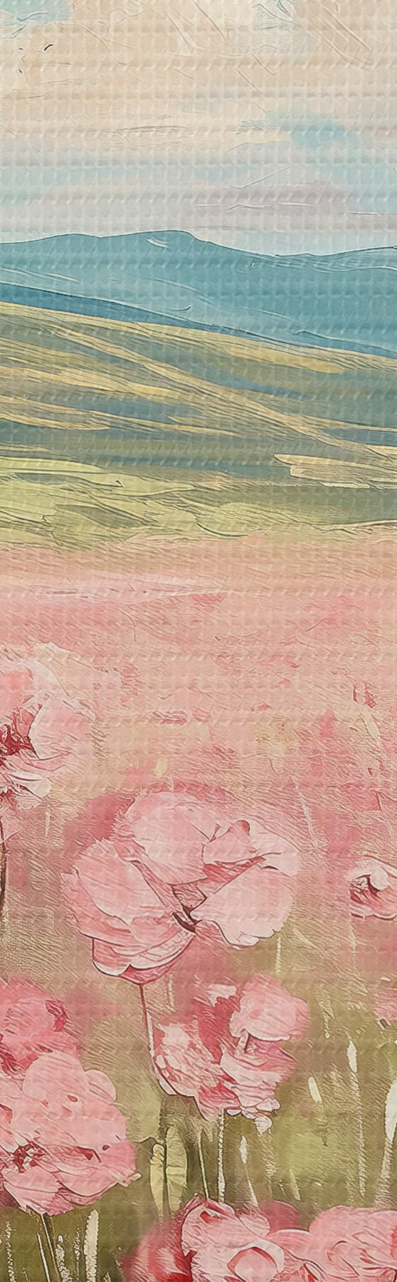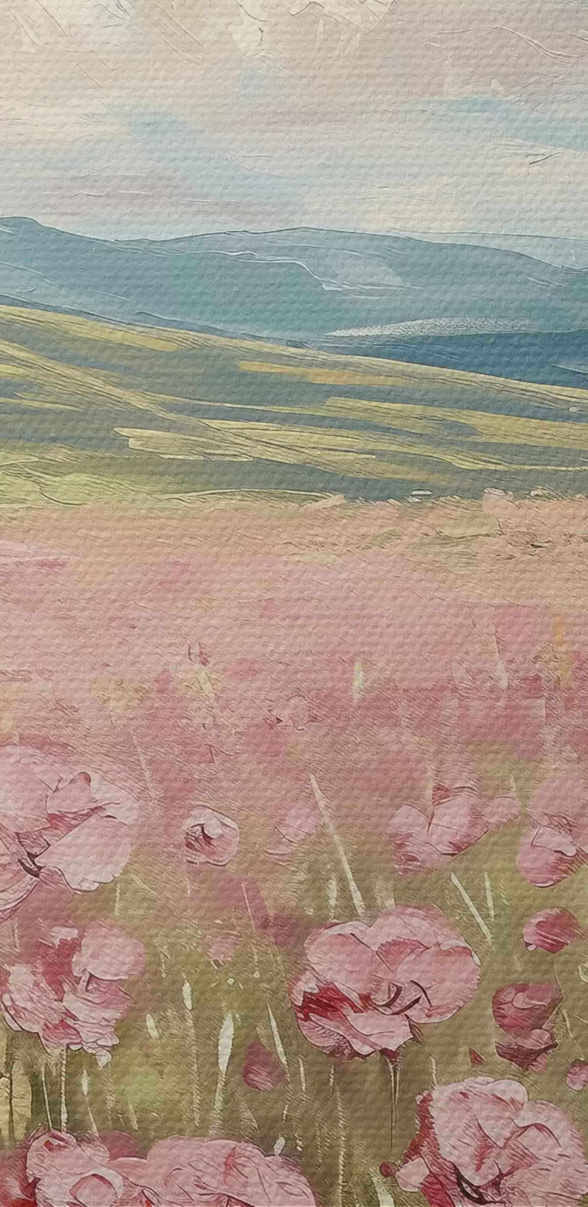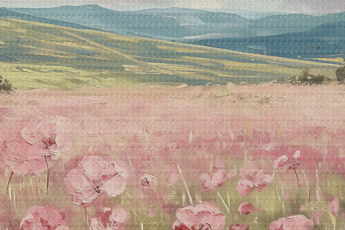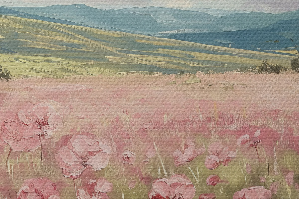 Immagine Prato con fiori rosa, montagne, paesaggio naturale, cielo azzurro con nuvole, acrilico Nr r40232