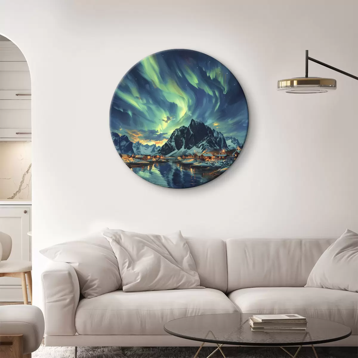Quadri rotondi Lofoten, aurora boreale, villaggio invernale r40299