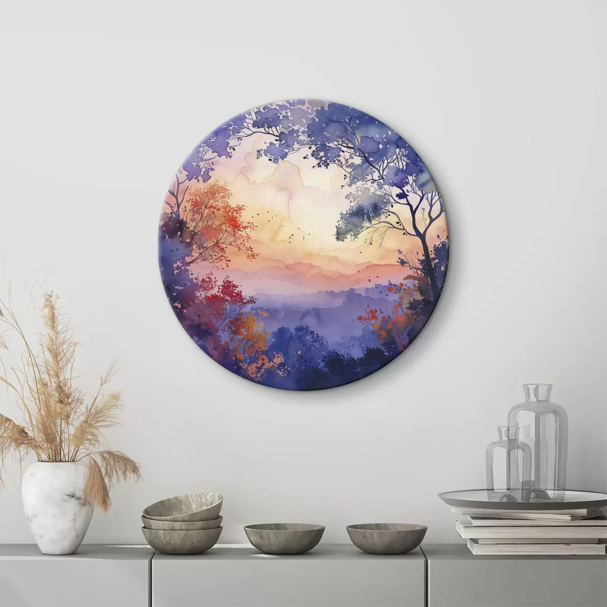 Quadri rotondi Foresta acquerellata, tramonto, rami di alberi, viola e arancione r40304
