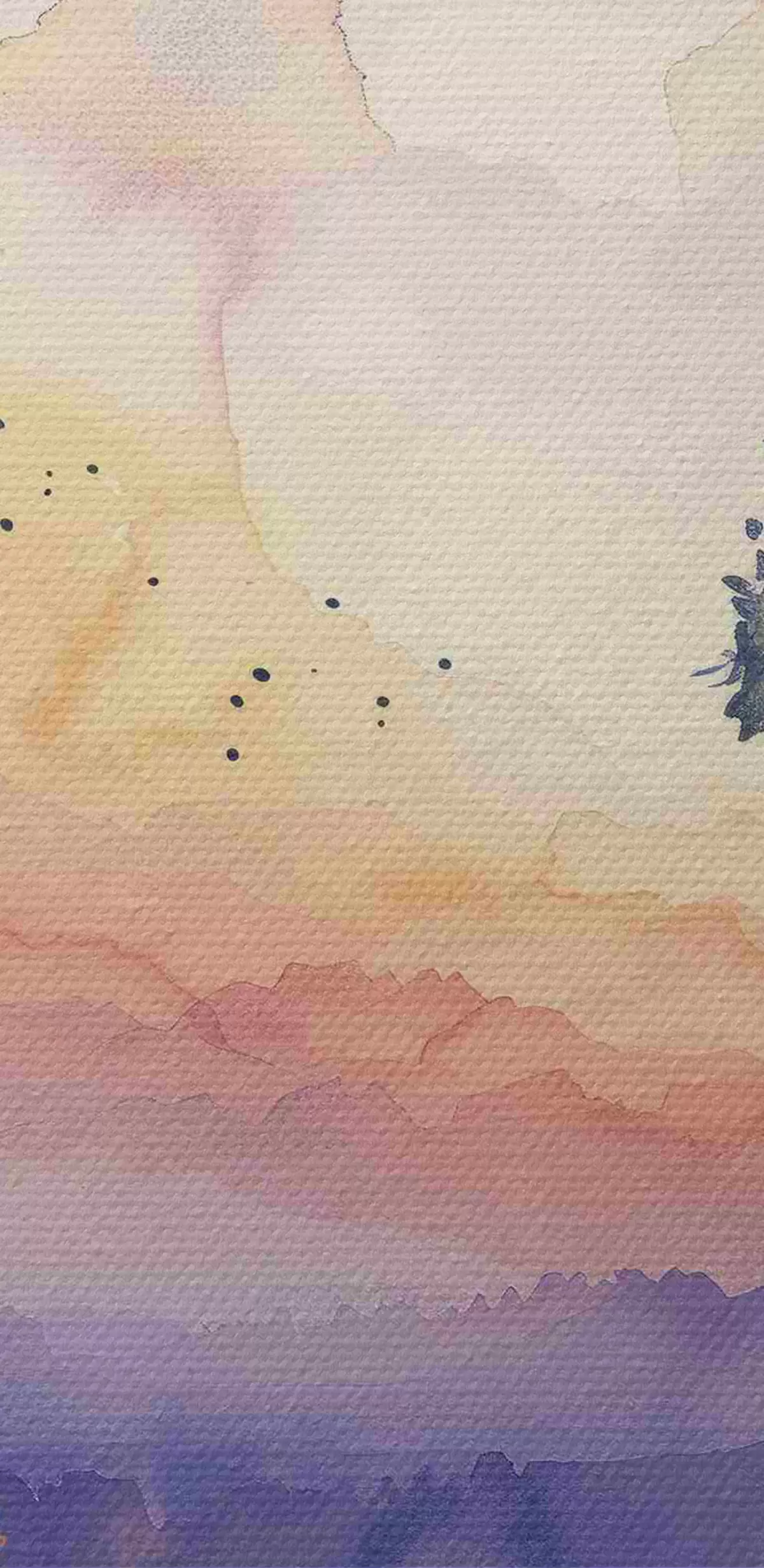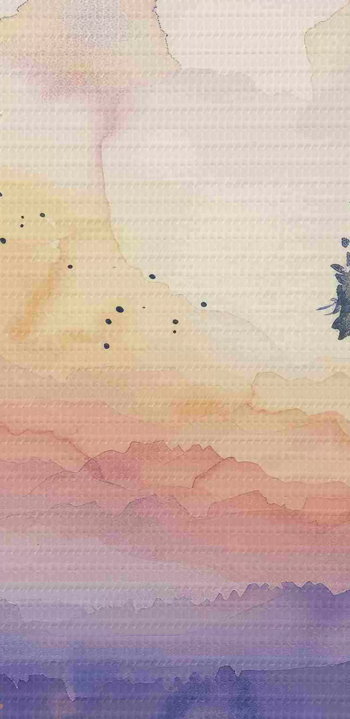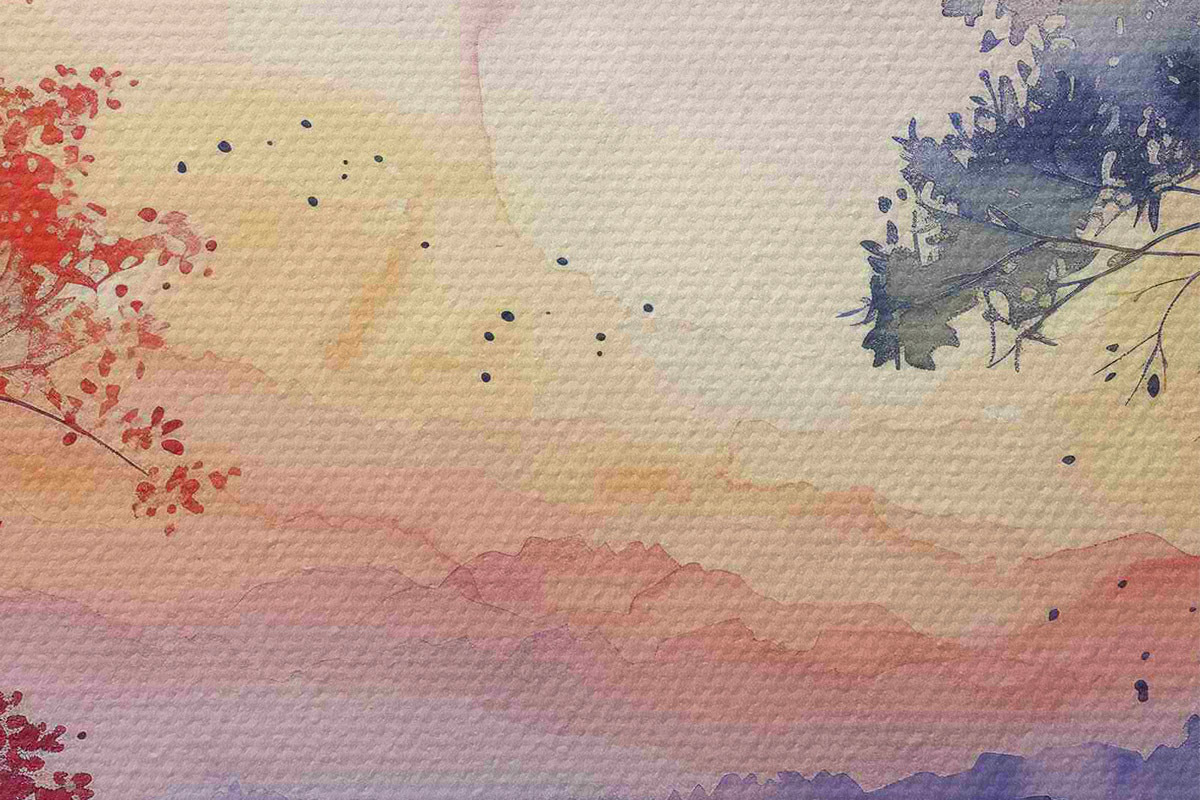 Immagine Foresta acquerellata, tramonto, rami di alberi, viola e arancione Nr r40304