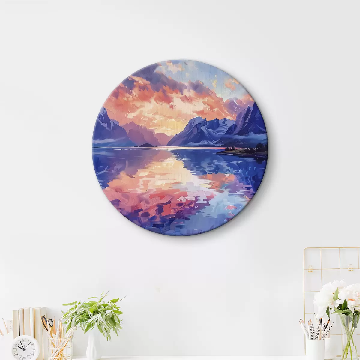 Quadri rotondi Tramonto in montagna, fiume, pittura acrilica r40305