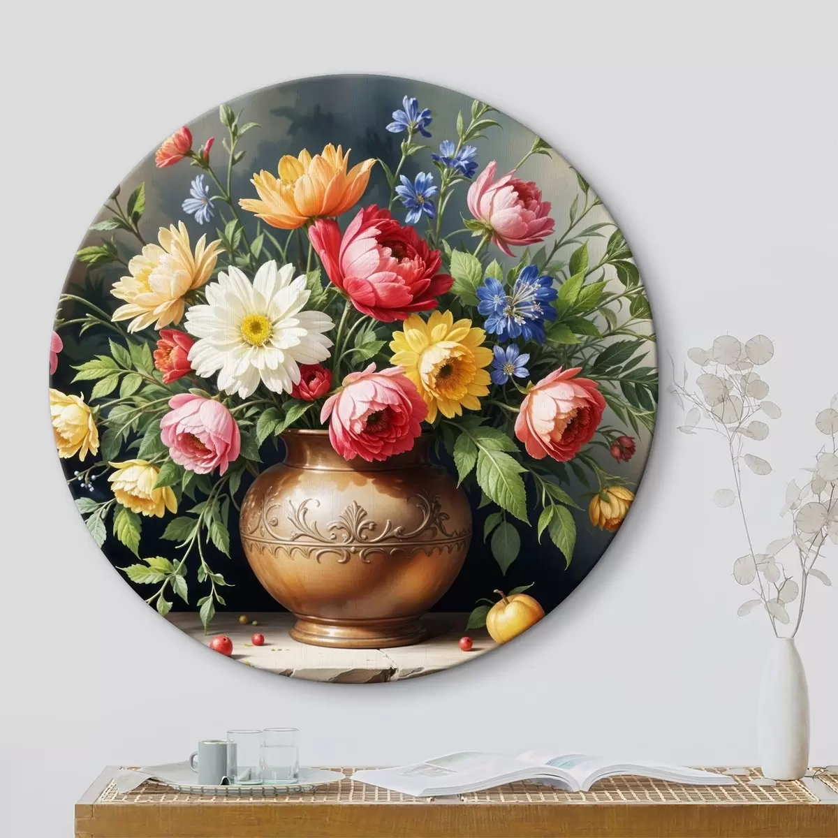 Quadri rotondi Un dipinto vibrante di un bouquet di fiori colorati tra cui rose rosse, narcisi gialli e margherite bianche r40395