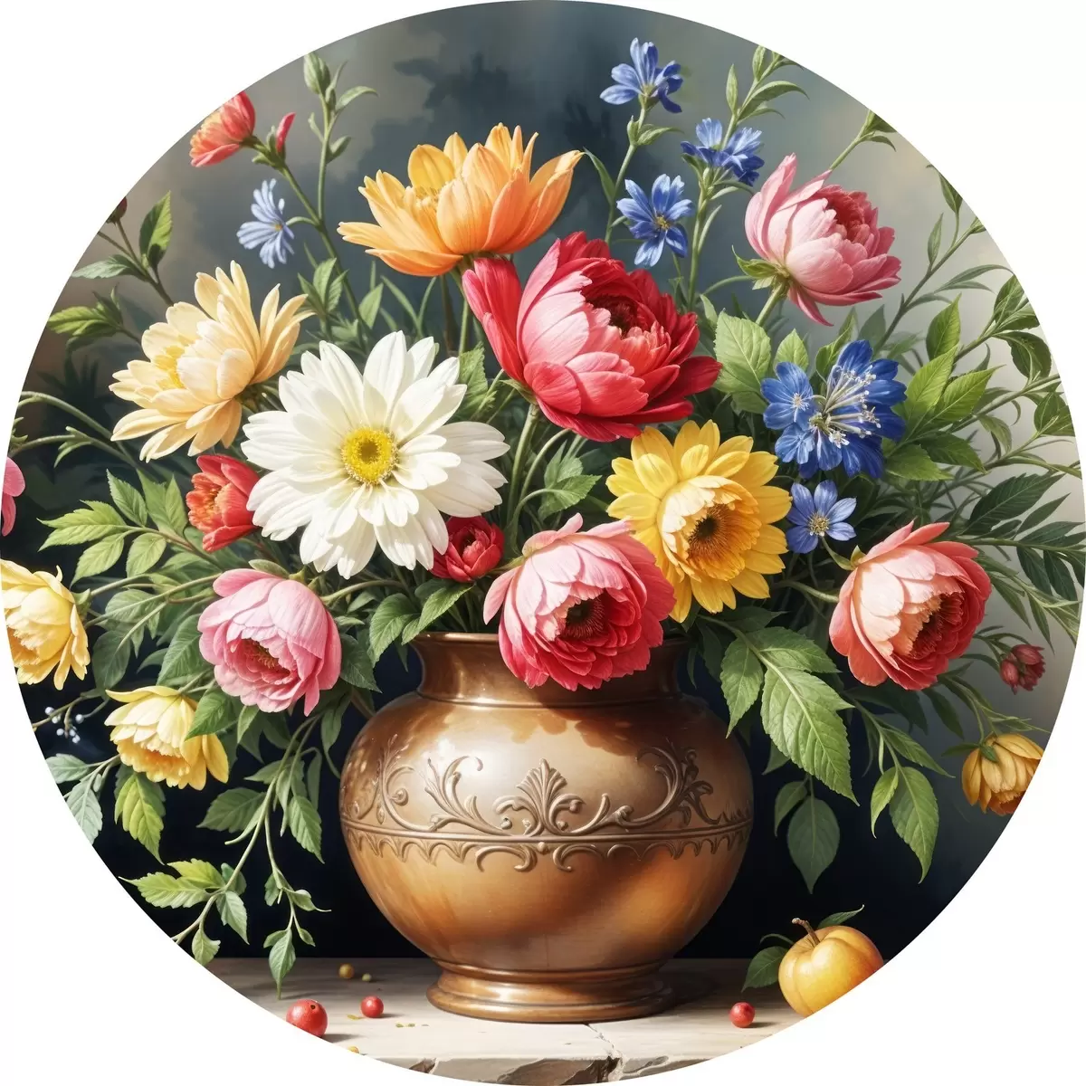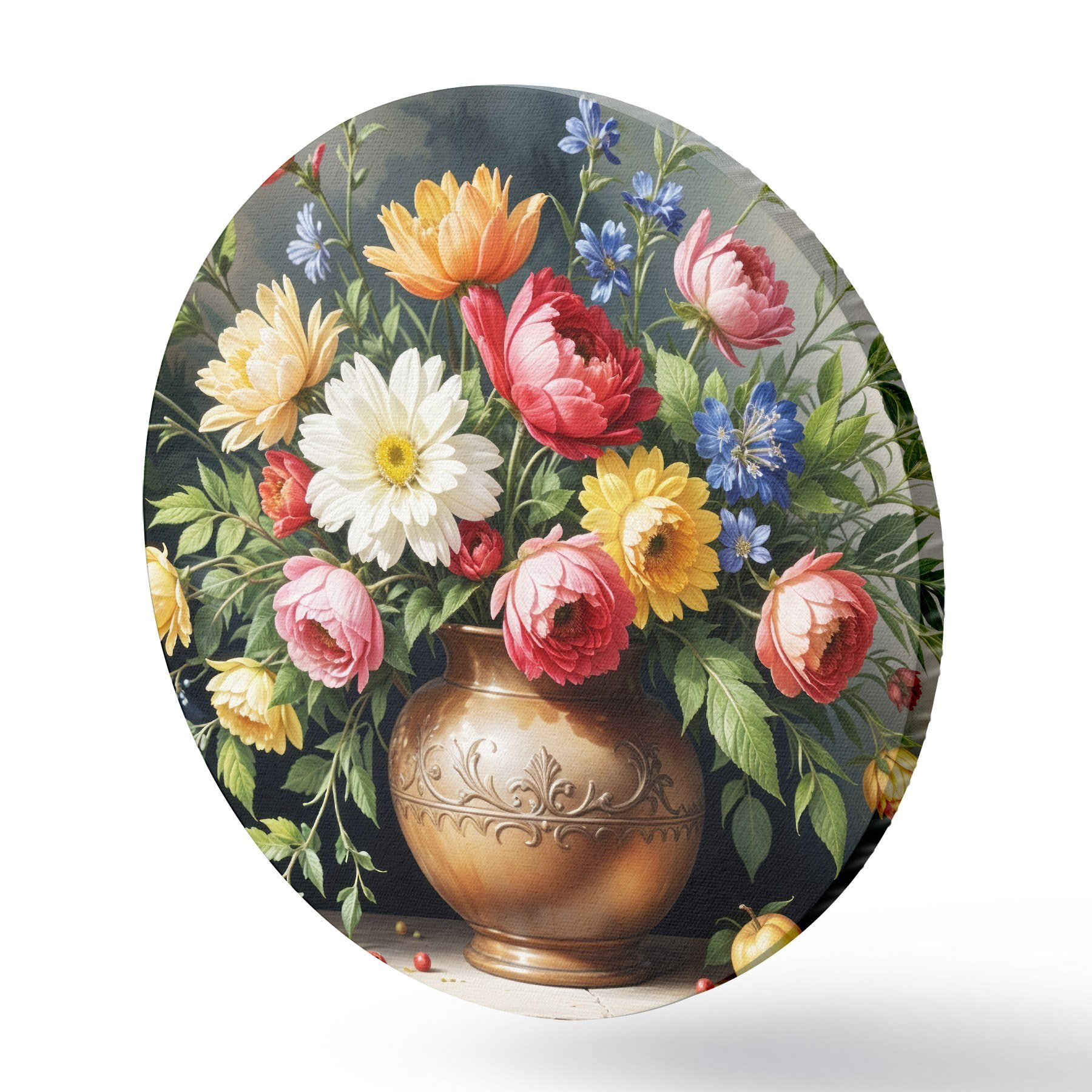 Quadri rotondi Un dipinto vibrante di un bouquet di fiori colorati tra cui rose rosse, narcisi gialli e margherite bianche r40395