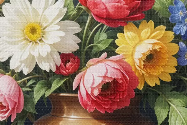 Immagine Un dipinto vibrante di un bouquet di fiori colorati tra cui rose rosse, narcisi gialli e margherite bianche Nr r40395