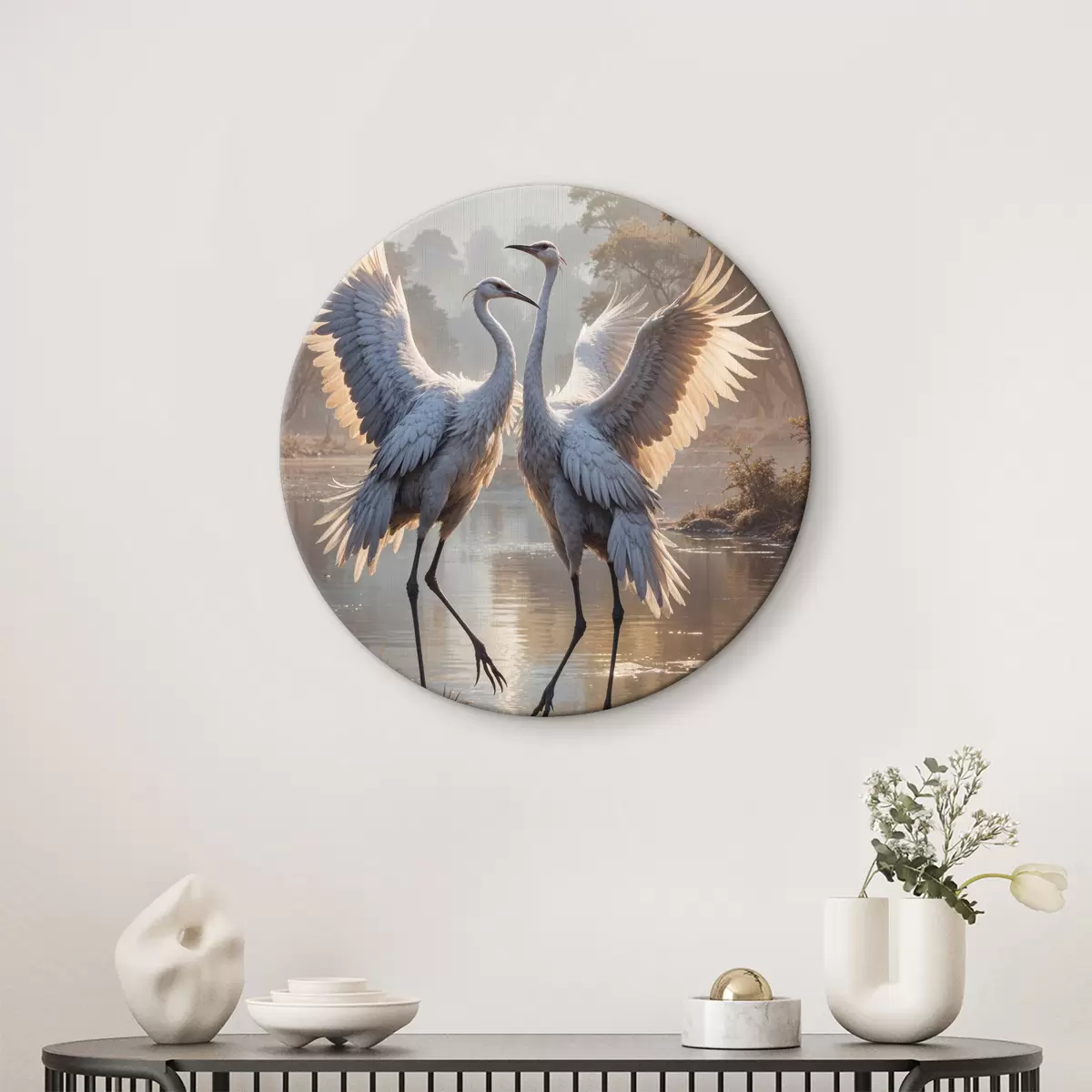 Quadri rotondi Due grandi gru grigie con lunghi colli e ali spiegate in piedi in un lago nebbioso circondato da alberi r40404