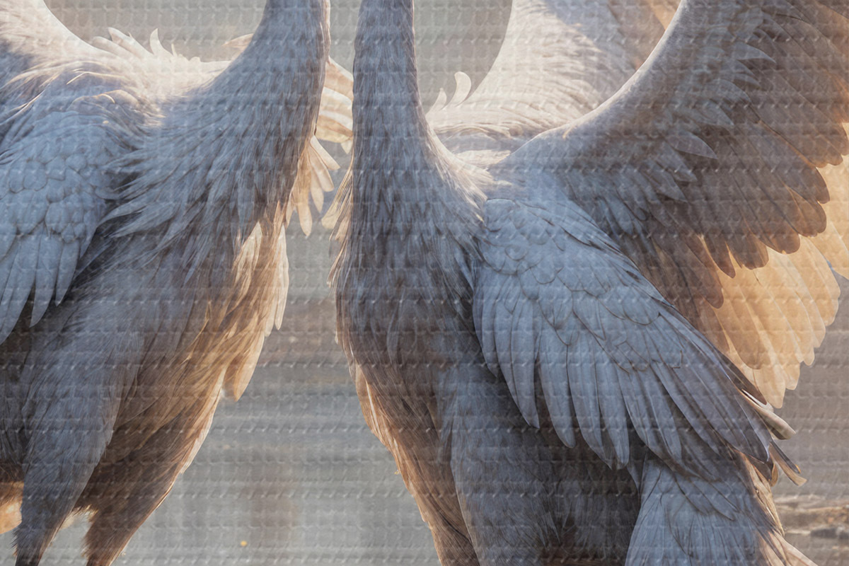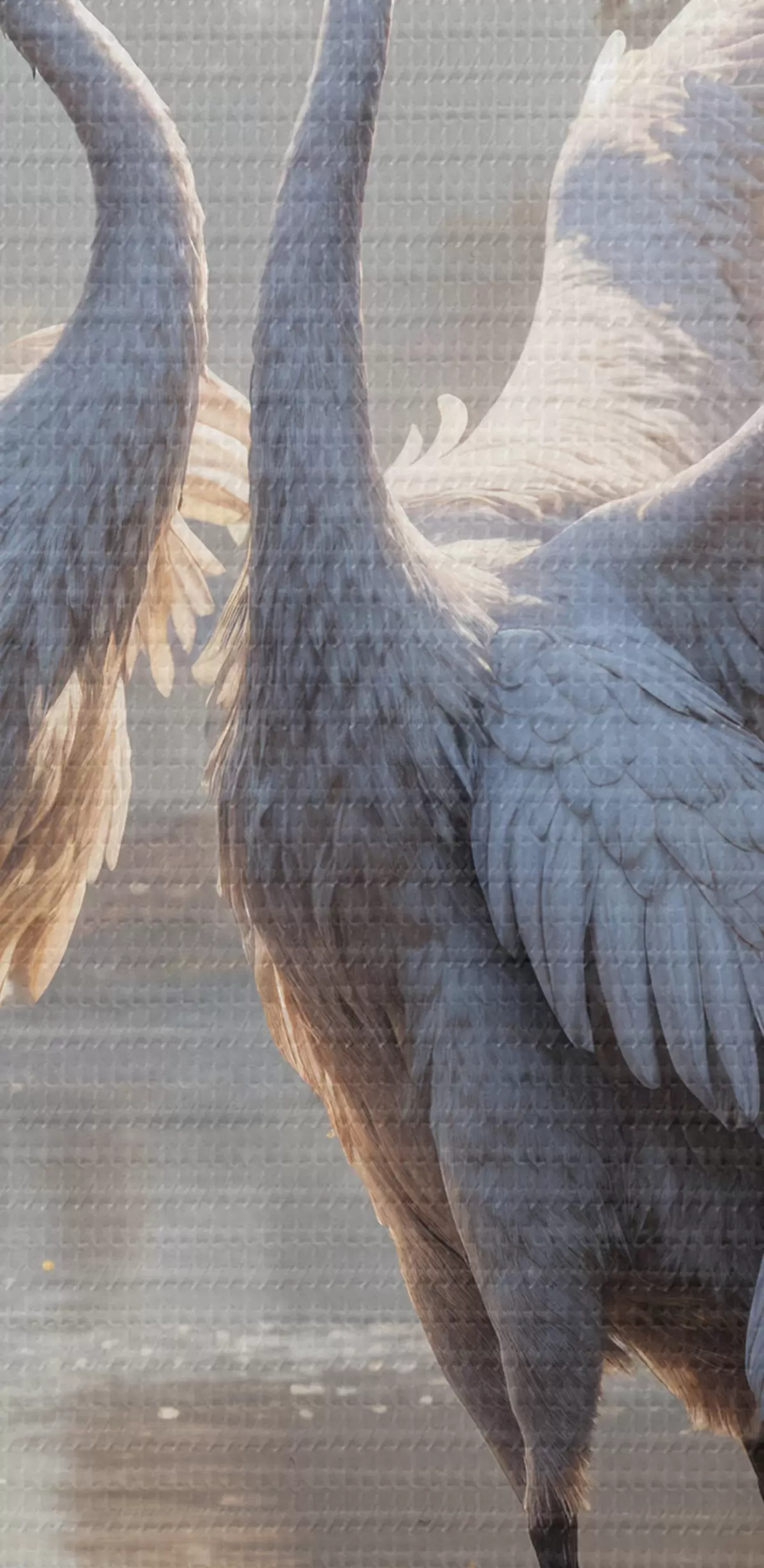 Immagine Due grandi gru grigie con lunghi colli e ali spiegate in piedi in un lago nebbioso circondato da alberi Nr r40404