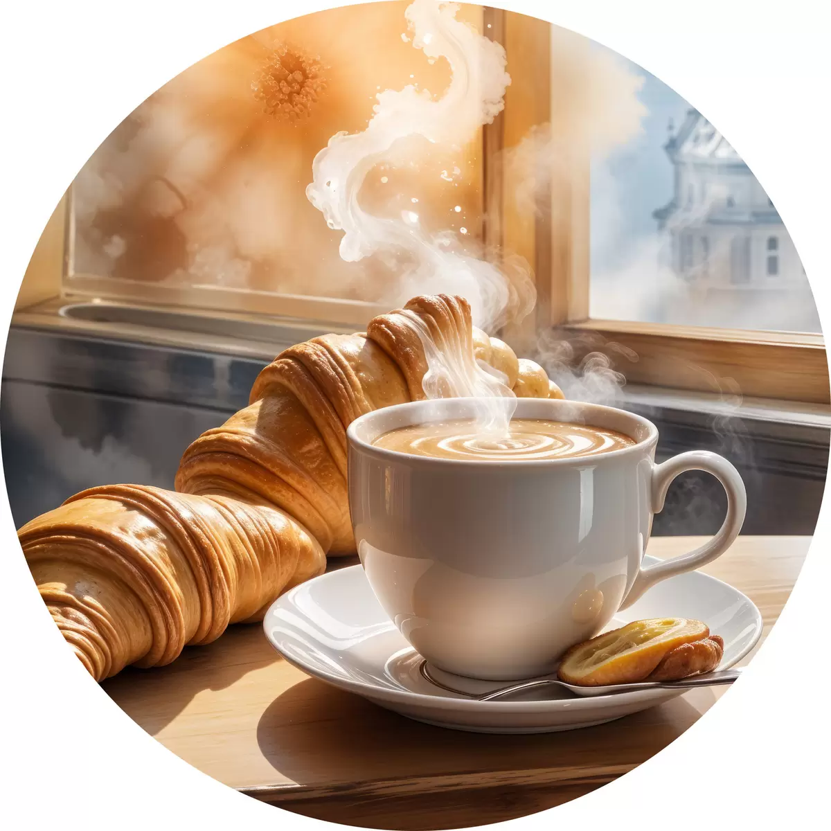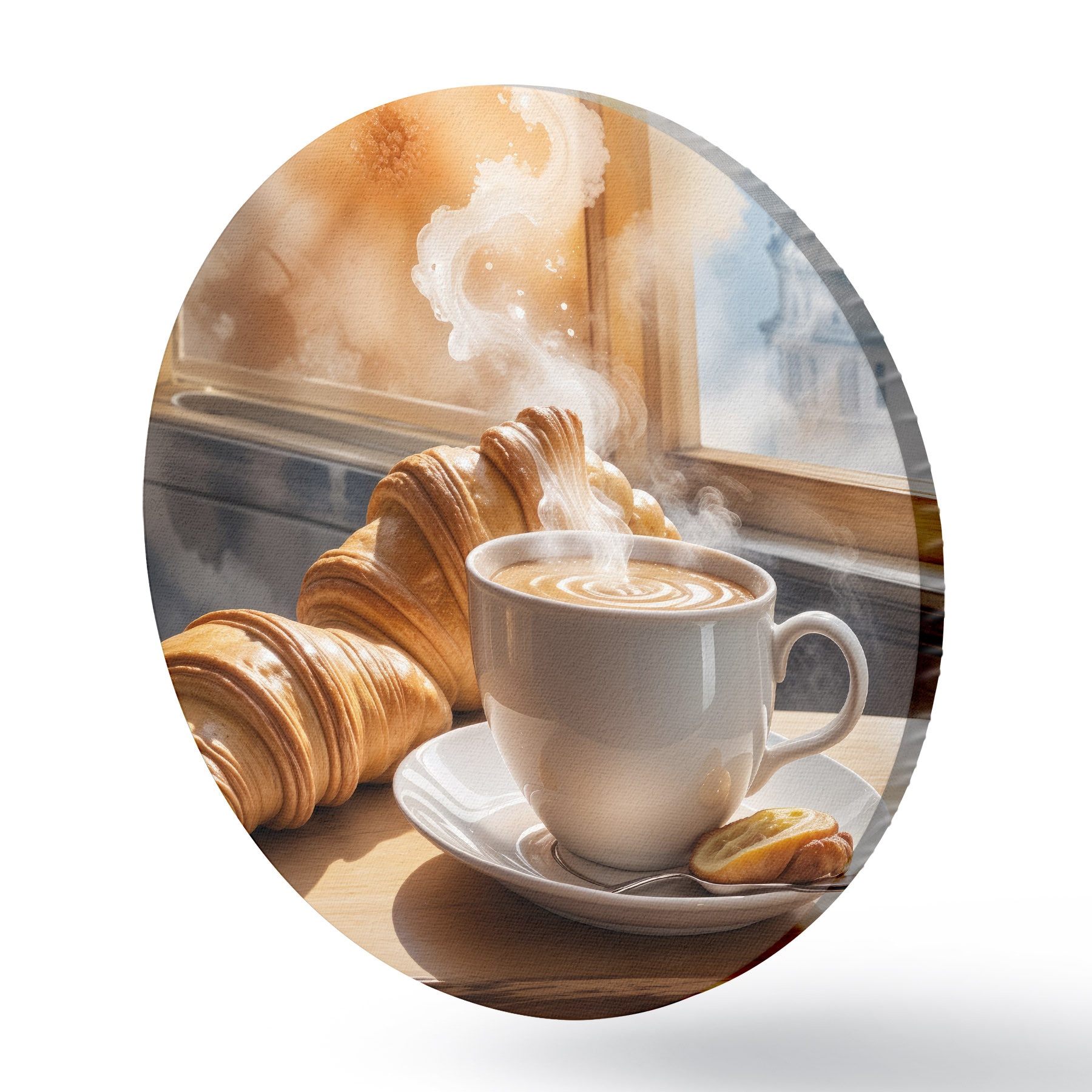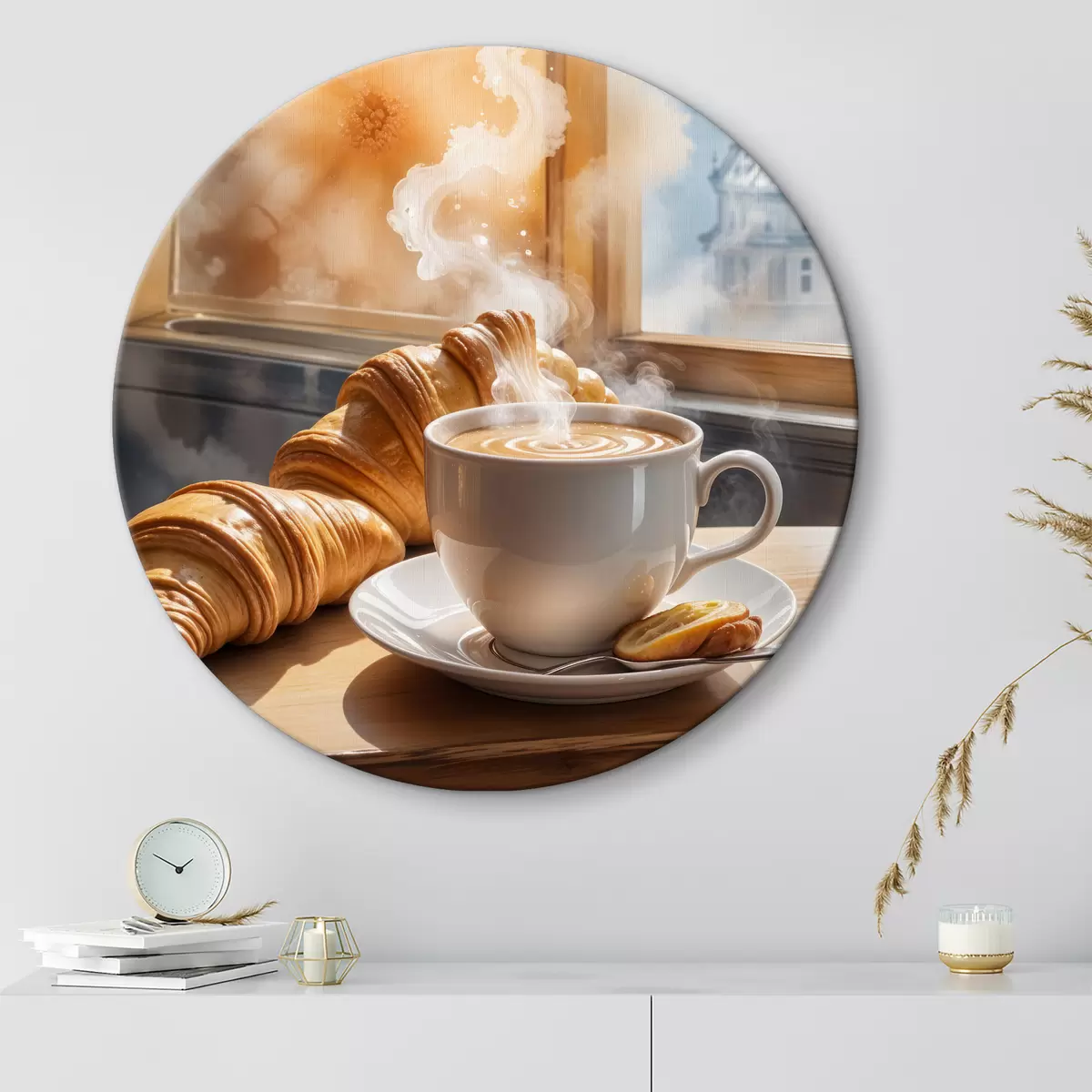 Quadri rotondi Una tazza di caffè caldo con il vapore che sale, appoggiata su un tavolo accanto a un croissant, con vista su un edificio storico r40405