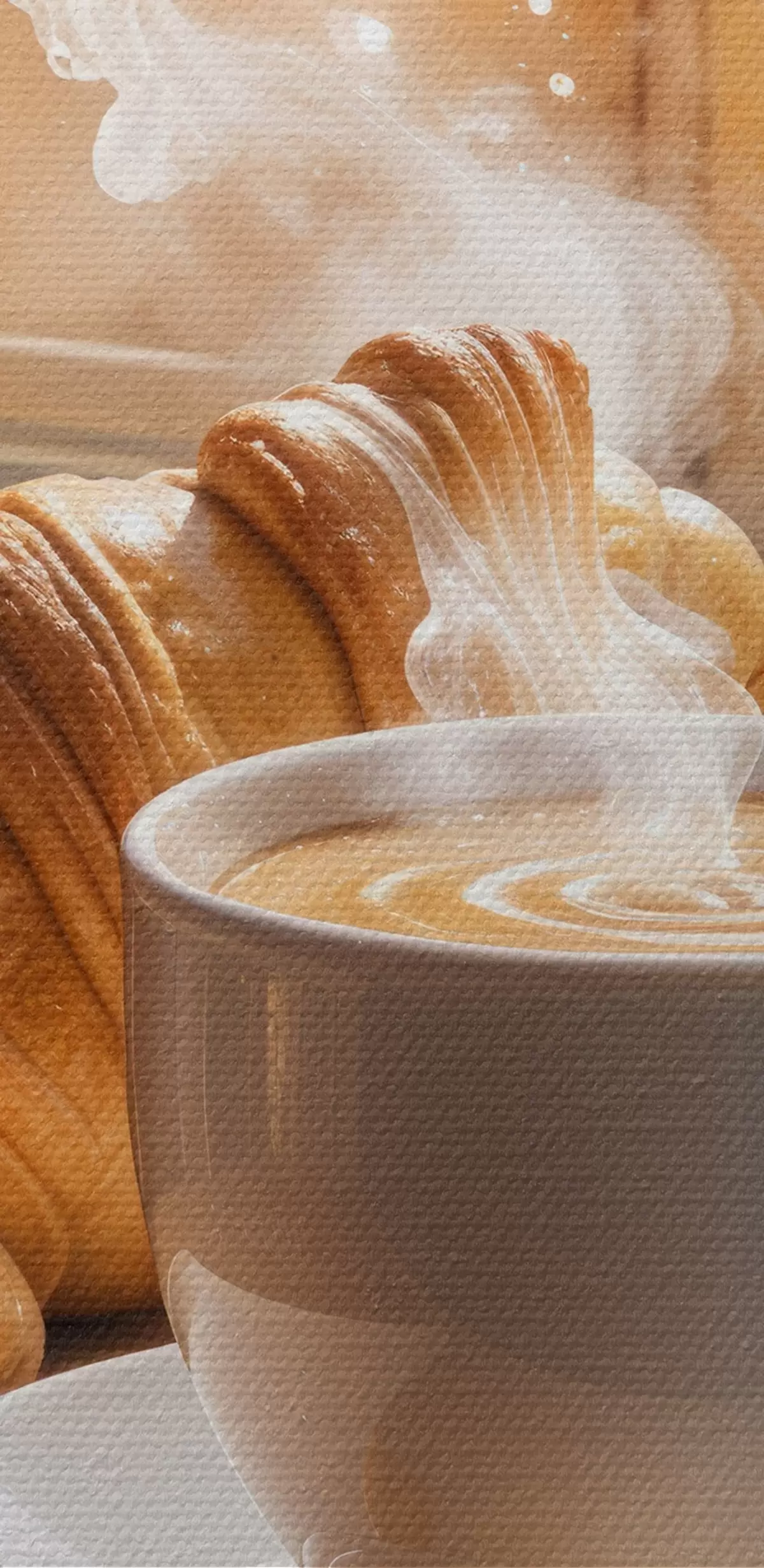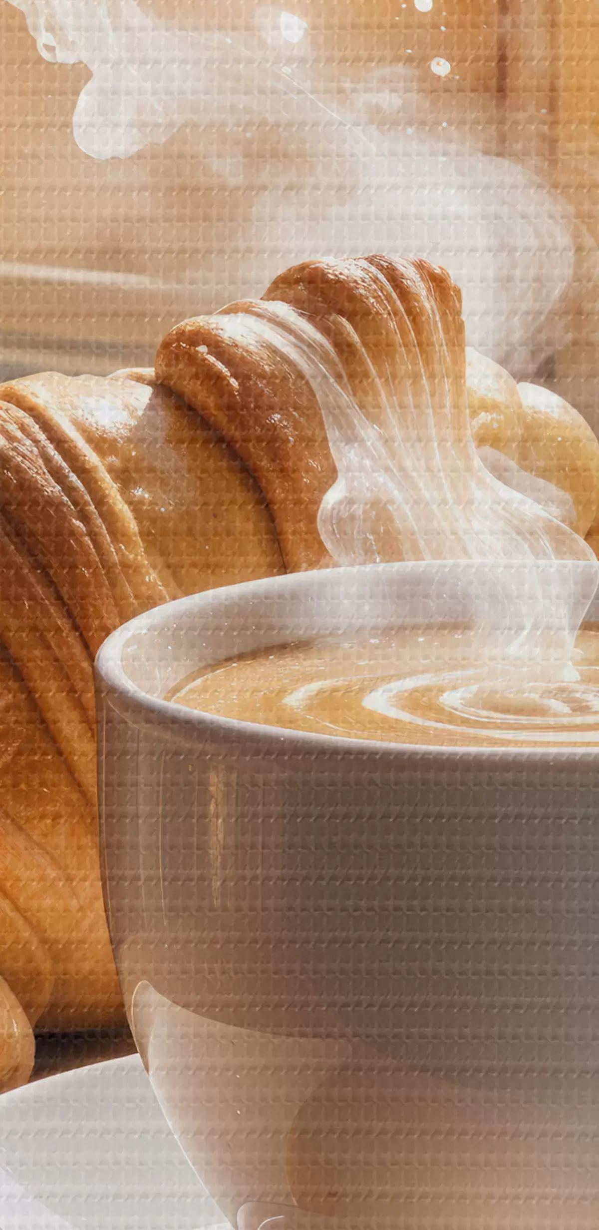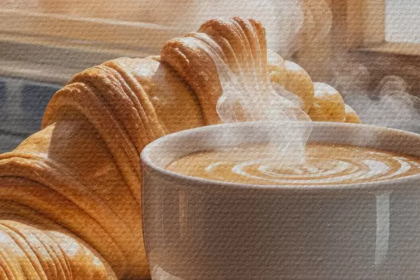 Immagine Una tazza di caffè caldo con il vapore che sale, appoggiata su un tavolo accanto a un croissant, con vista su un edificio storico Nr r40405